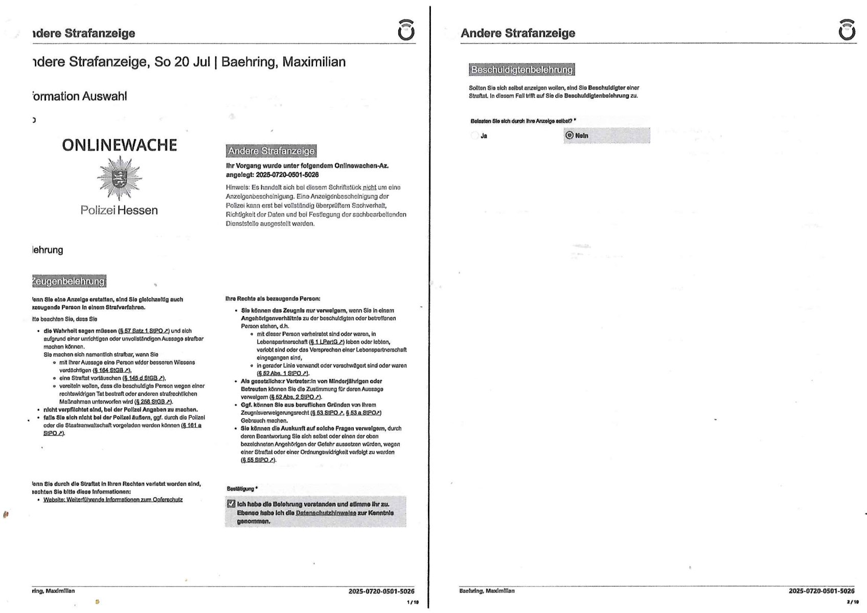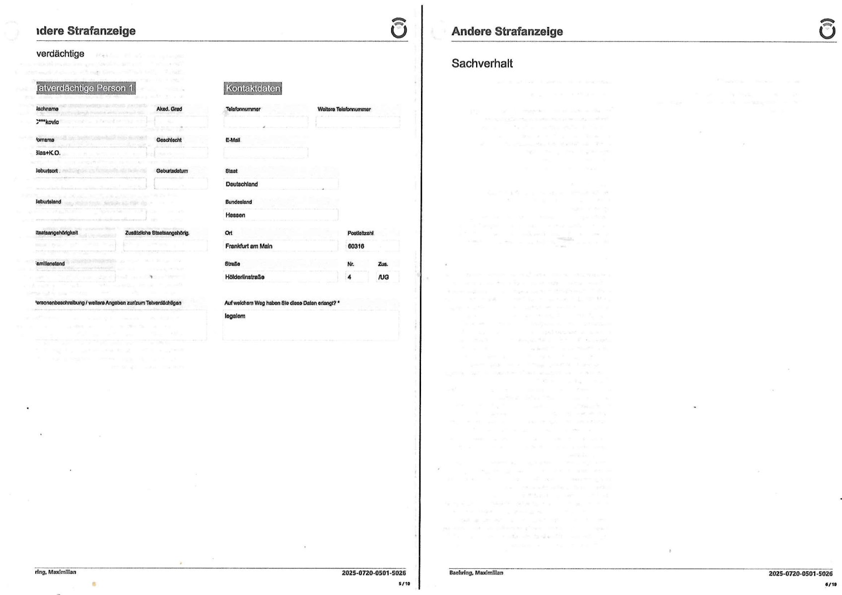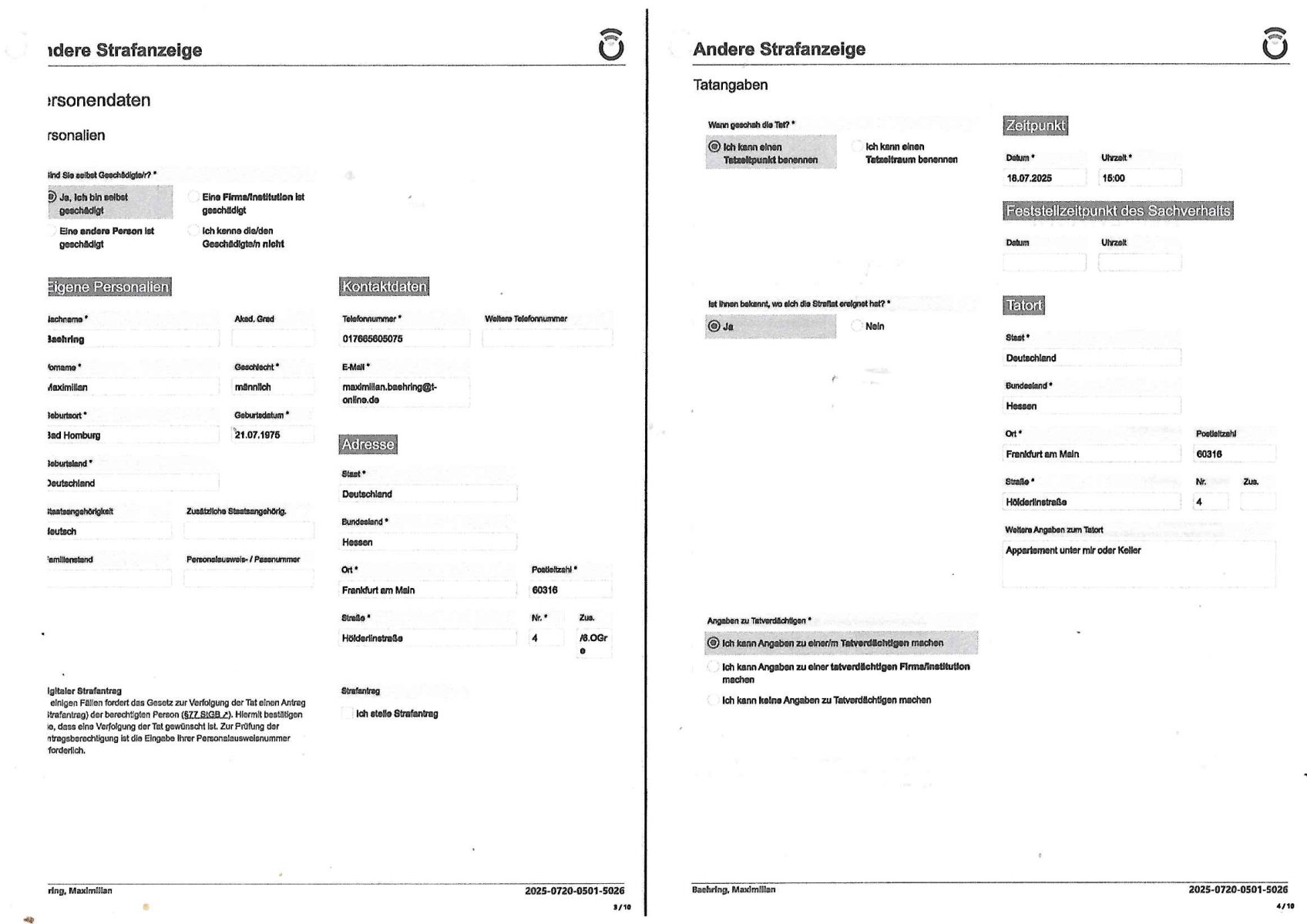 20.07.2025 05:02 Andere Strafanzeige, So 20 Jul | Baehring, Maximilian Andere Strafanzeige Ihr Vorgang wurde unter folgendem Onlinewachen-Az. angelegt: 2025-0720-0501-5026 Belehrung Bestätigung * 1 / 10 Andere Strafanzeige Baehring, Maximilian 2025-0720-0501-5026 Beschuldigtenbelehrung Sollten Sie sich selbst anzeigen wollen, sind Sie Beschuldigter einer Straftat. In diesem Fall trifft auf Sie die Beschuldigtenbelehrung zu. Belasten Sie sich durch Ihre Anzeige selbst? * Nein 2 / 10 Andere Strafanzeige Baehring, Maximilian 2025-0720-0501-5026 Personendaten Personalien Sind Sie selbst Geschädigte/r? * Ja, ich bin selbst geschädigt Eigene Personalien Nachname * Baehring Akad. Grad Vorname * Maximilian Geschlecht * männlich Geburtsort * Bad Homburg Geburtsdatum * 21.07.1975 Geburtsland * Deutschland Staatsangehörigkeit deutsch Zusätzliche Staatsangehörig. Familienstand Personalausweis- / Passnummer Kontaktdaten Telefonnummer * 017665605075 Weitere Telefonnummer E-Mail * maximilian.baehring@t- online.de Adresse Staat * Deutschland Bundesland * Hessen Ort * Frankfurt am Main Postleitzahl * 60316 Straße * Hölderlinstraße Nr. * 4 Zus. /6.OGr e Digitaler Strafantrag In einigen Fällen fordert das Gesetz zur Verfolgung der Tat einen Antrag (Strafantrag) der berechtigten Person (§77 StGB ? ). Hiermit bestätigen Sie, dass eine Verfolgung der Tat gewünscht ist. Zur Prüfung der Antragsberechtigung ist die Eingabe Ihrer Personalausweisnummer erforderlich. Ich stelle Strafantrag Strafantrag 3 / 10 Andere Strafanzeige Baehring, Maximilian 2025-0720-0501-5026 Tatangaben Wann geschah die Tat? * Ich kann einen Tatzeitpunkt benennen Zeitpunkt Datum * 18.07.2025 Uhrzeit * 15:00 Feststellzeitpunkt des Sachverhalts Datum Uhrzeit Ist Ihnen bekannt, wo sich die Straftat ereignet hat? * Ja Tatort Staat * Deutschland Bundesland * Hessen Ort * Frankfurt am Main Postleitzahl 60316 Straße * Hölderlinstraße Nr. 4 Zus. Weitere Angaben zum Tatort Appartement unter mir oder Keller Angaben zu Tatverdächtigen * Ich kann Angaben zu einer/m Tatverdächtigen machen Ich kann Angaben zu einer tatverdächtigen Firma/Institution machen Ich kann keine Angaben zu Tatverdächtigen machen Andere Strafanzeige Baehring, Maximilian 2025-0720-0501-5026 4 / 10 Tatverdächtige Tatverdächtige Person 1 Nachname C***kovic Akad. Grad Vorname Blas+K.O. Geschlecht Geburtsort Geburtsdatum Geburtsland Staatsangehörigkeit Zusätzliche Staatsangehörig. Familienstand Kontaktdaten Telefonnummer Weitere Telefonnummer Staat Deutschland Bundesland Hessen Ort Frankfurt am Main Postleitzahl 60316 Straße Hölderlinstraße Nr. 4 Zus. /UG Personenbeschreibung / weitere Angaben zur/zum Tatverdächtigen Auf welchem Weg haben Sie diese Daten erlangt? * legalem 5 / 10 Andere Strafanzeige Baehring, Maximilian 2025-0720-0501-5026 Sachverhalt 6 / 10 Andere Strafanzeige Baehring, Maximilian 2025-0720-0501-5026 Andere Strafanzeige Welche Straftat wollen Sie anzeigen? * Comutersabotage kappen von Fetsnetz/DSL- Anshclußleitungskabeln - vehctes inden Suzid hetzen per Psychoterror Beschreiben Sie den Sachverhalt möglichst detailliert * rest des texts: siehe anhang oder http://banktunnel.eu/sch-einesystem/20250719.htm ([1] http://banktunnel.eu/sch-einesystem/20250720.htm auch als PDF-Datei (sch-einesystem.163) ([2] zum download unter http://banktunnel.eu/pdf.php #herrhausen#RAFterror#badHomburg#zentralBank http://blog.sch-einesystem.de/ oder https://zentral-bank.eu/tumblr.com/ https://bad-homburg.eu/download/ --- [1] URL-Format http://banktunnel.eu/sch-einesystem/YYYYMMDD.htm YYYY = Year/Jahr, MM = Month/Monat, DD = Day/Tag [2] URL-Format http://banktunnel.eu/tumblr.com/sch-einesystem.###.pdf ### = fortaulfene, seit 84 monatlich um 1 erhöhte Nummer wahlweise als PDF oder HTML Datei, auch per HTTPS (SSL) https://zentral-bank.eu/tumblr.com/sch-einesystem.###.htm --- Wie sie wissen kann ich nichts für meine Rechtschreibung, das ist so seitdem ich von Cops mit dem kopf gegen die wand gehauen wurde 10 Tage nachdem ich sie wegen Korruption strafazeiget am 13. Mai 2013. Zuvor hate ich seit Ende 2006/Anfang 2007 versucht die Polizei und Staatsanwaltschaft hier zum arbeiten zu bewegen (z.B. 3 Zs 1795/08 GStA FFM) nachdem ich schon nach Wiesbaden fahren musste (BKA/LKA/Kotakt bei Polize RlP Wielandt) als korrupte Cops in Bad Homburg nicht arbeiteten. Abetwa 2009 kam es zu Sabotageakten an der Haustechnik hier, der Vermieter wurde erpresst vondern mainova, ich hab das angezeigt. Dann wurd ich von einem mann, dem Unter-mieter meiner Nachbarin "kataj Zajac" aus einem appartement untendrunter "Piotr Michalek" fast halbtot gewürgt ( "wuergerjagd" blog) dazu gab es 2016/2017 ein Verfahren, ich mußte mich am 08. August 2015 (?) notwehren asl ich für die polize Fahndunsg-fotos schoß wie abgesprochen. Immer wieder gab es Ärger im Haus, man schaltete den Strom ab und wollte mich zwingen siets deshsusietere Strom aus der neue hauseigenen Solaranlage zu überhöhten Preisen zu kaufen statt dem Tarif der Stadtwerke. Es sidn genau die Probleme die auch die zahlungssäumigen Mieter meiner Eltren in der Kappesgasse 2(a?) Bad Homburg Ober Erlenbach hatten. Eprssungen duch Öko-terror-Durückerkolonenn. Immer wider vruchteman mich zu eprssne DSL verträge mit Vorsncaner zansgabos oder ähliche Zustabaos abzu- schließen die ich nicht wollte. Etwa 2012 erfuhr ch vonenm fühern abriets/barchenkollegendvondaß der Ex-Frund dermutermeienrtchtermysteriös auf ienr BDSM/SAdo_amso paryt ums Leben gekomen sei udn hatesoftr grosse Angst ums Kind, stellte trotz daß ich erprsst wrden war udn man mir das Kidn indieerblien hinvgletgt hate 1999 uter Vgeiftung mit Pscho-Drogen Sorgechtsantrag ( "tabea-lara" - das ist der name des m19.9.200 gebroren kindes - blog). di evrgeltgungdern opfr ichwurde habich 7 / 10 Andere Strafanzeige Baehring, Maximilian 2025-0720-0501-5026 angeszget 3zs 1795/08 GStA FFM. Man hatmir ds kind indie erblievegreltgt weil ich als Rektere eure Ztung Korrution i