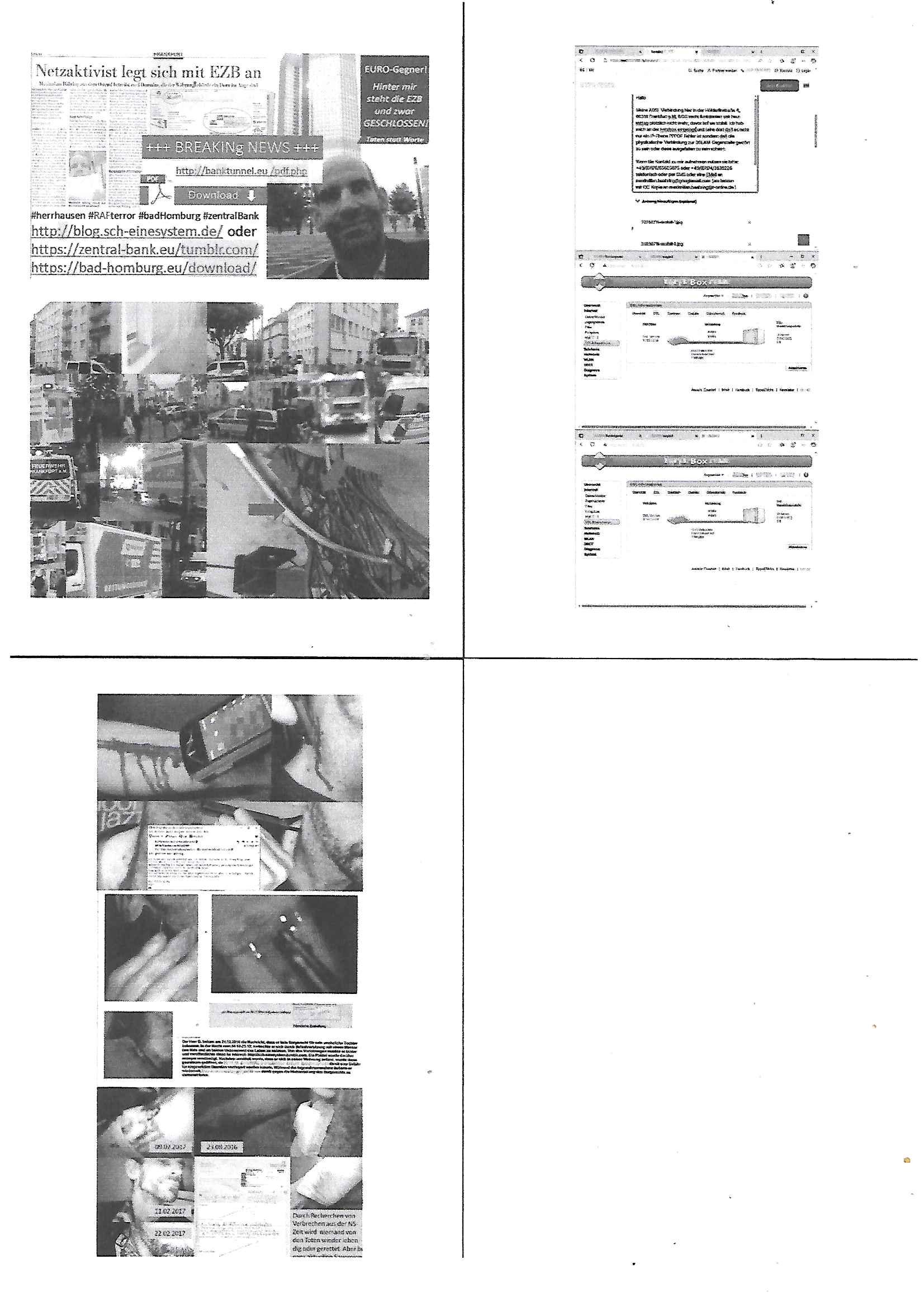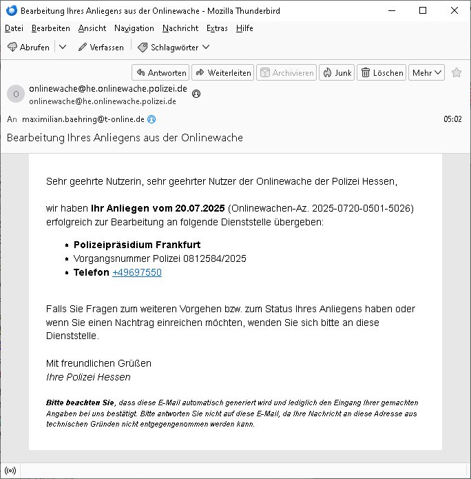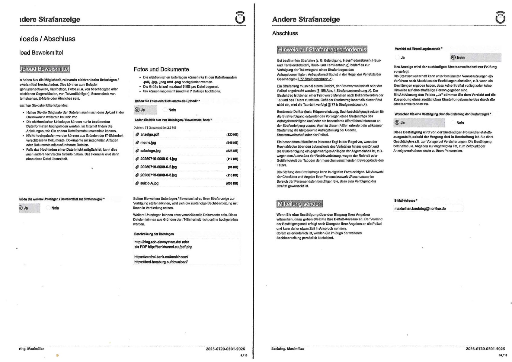 20.07.2025 05:02 Andere Strafanzeige, So 20 Jul | Baehring, Maximilian Andere Strafanzeige Ihr Vorgang wurde unter folgendem Onlinewachen-Az. angelegt: 2025-0720-0501-5026 Belehrung Bestätigung * 1 / 10 Andere Strafanzeige Baehring, Maximilian 2025-0720-0501-5026 Beschuldigtenbelehrung Sollten Sie sich selbst anzeigen wollen, sind Sie Beschuldigter einer Straftat. In diesem Fall trifft auf Sie die Beschuldigtenbelehrung zu. Belasten Sie sich durch Ihre Anzeige selbst? * Nein 2 / 10 Andere Strafanzeige Baehring, Maximilian 2025-0720-0501-5026 Personendaten Personalien Sind Sie selbst Geschädigte/r? * Ja, ich bin selbst geschädigt Eigene Personalien Nachname * Baehring Akad. Grad Vorname * Maximilian Geschlecht * männlich Geburtsort * Bad Homburg Geburtsdatum * 21.07.1975 Geburtsland * Deutschland Staatsangehörigkeit deutsch Zusätzliche Staatsangehörig. Familienstand Personalausweis- / Passnummer Kontaktdaten Telefonnummer * 017665605075 Weitere Telefonnummer E-Mail * maximilian.baehring@t- online.de Adresse Staat * Deutschland Bundesland * Hessen Ort * Frankfurt am Main Postleitzahl * 60316 Straße * Hölderlinstraße Nr. * 4 Zus. /6.OGr e Digitaler Strafantrag In einigen Fällen fordert das Gesetz zur Verfolgung der Tat einen Antrag (Strafantrag) der berechtigten Person (§77 StGB ? ). Hiermit bestätigen Sie, dass eine Verfolgung der Tat gewünscht ist. Zur Prüfung der Antragsberechtigung ist die Eingabe Ihrer Personalausweisnummer erforderlich. Ich stelle Strafantrag Strafantrag 3 / 10 Andere Strafanzeige Baehring, Maximilian 2025-0720-0501-5026 Tatangaben Wann geschah die Tat? * Ich kann einen Tatzeitpunkt benennen Zeitpunkt Datum * 18.07.2025 Uhrzeit * 15:00 Feststellzeitpunkt des Sachverhalts Datum Uhrzeit Ist Ihnen bekannt, wo sich die Straftat ereignet hat? * Ja Tatort Staat * Deutschland Bundesland * Hessen Ort * Frankfurt am Main Postleitzahl 60316 Straße * Hölderlinstraße Nr. 4 Zus. Weitere Angaben zum Tatort Appartement unter mir oder Keller Angaben zu Tatverdächtigen * Ich kann Angaben zu einer/m Tatverdächtigen machen Ich kann Angaben zu einer tatverdächtigen Firma/Institution machen Ich kann keine Angaben zu Tatverdächtigen machen Andere Strafanzeige Baehring, Maximilian 2025-0720-0501-5026 4 / 10 Tatverdächtige Tatverdächtige Person 1 Nachname C***kovic Akad. Grad Vorname Blas+K.O. Geschlecht Geburtsort Geburtsdatum Geburtsland Staatsangehörigkeit Zusätzliche Staatsangehörig. Familienstand Kontaktdaten Telefonnummer Weitere Telefonnummer Staat Deutschland Bundesland Hessen Ort Frankfurt am Main Postleitzahl 60316 Straße Hölderlinstraße Nr. 4 Zus. /UG Personenbeschreibung / weitere Angaben zur/zum Tatverdächtigen Auf welchem Weg haben Sie diese Daten erlangt? * legalem 5 / 10 Andere Strafanzeige Baehring, Maximilian 2025-0720-0501-5026 Sachverhalt 6 / 10 Andere Strafanzeige Baehring, Maximilian 2025-0720-0501-5026 Andere Strafanzeige Welche Straftat wollen Sie anzeigen? * Comutersabotage kappen von Fetsnetz/DSL- Anshclußleitungskabeln - vehctes inden Suzid hetzen per Psychoterror Beschreiben Sie den Sachverhalt möglichst detailliert * rest des texts: siehe anhang oder http://banktunnel.eu/sch-einesystem/20250719.htm ([1] http://banktunnel.eu/sch-einesystem/20250720.htm auch als PDF-Datei (sch-einesystem.163) ([2] zum download unter http://banktunnel.eu/pdf.php #herrhausen#RAFterror#badHomburg#zentralBank http://blog.sch-einesystem.de/ oder https://zentral-bank.eu/tumblr.com/ https://bad-homburg.eu/download/ --- [1] URL-Format http://banktunnel.eu/sch-einesystem/YYYYMMDD.htm YYYY = Year/Jahr, MM = Month/Monat, DD = Day/Tag [2] URL-Format http://banktunnel.eu/tumblr.com/sch-einesystem.###.pdf ### = fortaulfene, seit 84 monatlich um 1 erhöhte Nummer wahlweise als PDF oder HTML Datei, auch per HTTPS (SSL) https://zentral-bank.eu/tumblr.com/sch-einesystem.###.htm --- Wie sie wissen kann ich nichts für meine Rechtschreibung, das ist so seitdem ich von Cops mit dem kopf gegen die wand gehauen wurde 10 Tage nachdem ich sie wegen Korruption strafazeiget am 13. Mai 2013. Zuvor hate ich seit Ende 2006/Anfang 2007 versucht die Polizei und Staatsanwaltschaft hier zum arbeiten zu bewegen (z.B. 3 Zs 1795/08 GStA FFM) nachdem ich schon nach Wiesbaden fahren musste (BKA/LKA/Kotakt bei Polize RlP Wielandt) als korrupte Cops in Bad Homburg nicht arbeiteten. Abetwa 2009 kam es zu Sabotageakten an der Haustechnik hier, der Vermieter wurde erpresst vondern mainova, ich hab das angezeigt. Dann wurd ich von einem mann, dem Unter-mieter meiner Nachbarin "kataj Zajac" aus einem appartement untendrunter "Piotr Michalek" fast halbtot gewürgt ( "wuergerjagd" blog) dazu gab es 2016/2017 ein Verfahren, ich mußte mich am 08. August 2015 (?) notwehren asl ich für die polize Fahndunsg-fotos schoß wie abgesprochen. Immer wieder gab es Ärger im Haus, man schaltete den Strom ab und wollte mich zwingen siets deshsusietere Strom aus der neue hauseigenen Solaranlage zu überhöhten Preisen zu kaufen statt dem Tarif der Stadtwerke. Es sidn genau die Probleme die auch die zahlungssäumigen Mieter meiner Eltren in der Kappesgasse 2(a?) Bad Homburg Ober Erlenbach hatten. Eprssungen duch Öko-terror-Durückerkolonenn. Immer wider vruchteman mich zu eprssne DSL verträge mit Vorsncaner zansgabos oder ähliche Zustabaos abzu- schließen die ich nicht wollte. Etwa 2012 erfuhr ch vonenm fühern abriets/barchenkollegendvondaß der Ex-Frund dermutermeienrtchtermysteriös auf ienr BDSM/SAdo_amso paryt ums Leben gekomen sei udn hatesoftr grosse Angst ums Kind, stellte trotz daß ich erprsst wrden war udn man mir das Kidn indieerblien hinvgletgt hate 1999 uter Vgeiftung mit Pscho-Drogen Sorgechtsantrag ( "tabea-lara" - das ist der name des m19.9.200 gebroren kindes - blog). di evrgeltgungdern opfr ichwurde habich 7 / 10 Andere Strafanzeige Baehring, Maximilian 2025-0720-0501-5026 angeszget 3zs 1795/08 GStA FFM. Man hatmir ds kind indie erblievegreltgt weil ich als Rektere eure Ztung Korrution i