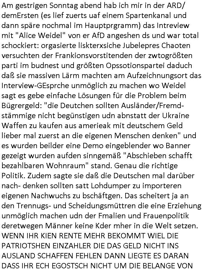 Am gestrigen Sonntag abend hab ich mir in der ARD/ demErsten (es lief zuerts uaf einem Spartenkanal und dann späre nochmal im Hauptprgramm) das Intreview mit "Alice Weidel" von er AfD angeshen ds und war total schockiert: orgasierte liskterxsiche Jubelepres Chaoten versuchten der Frankionsvorstitenden der zwtogrößten parti im budnest und größten Opssotionspartei daduch daß sie massiven Lärm machten am Aufzeichnungsort das Interview-GEsprche unmöglich zu machen wo Weidel sagt es gebe einfache Lösungen für die Problem beim Bügrergeld: "die Deutchen sollten Ausländer/Fremd-stämmige nicht begünstigen udn abnstatt der Ukraine Waffen zu kaufen aus amerieak mit deutschem Geld lieber mal zuerst an die eigenen Menschen denken" und es wurden beilder eine Demo eingeblender wo Banner gezeigt wurden aufden sinngemäß "Abschieben schafft bezahlbaren Wohnraum" stand. Genau die richtige Politik. Zudem sagte sie daß die Deutschen mal darüber nach- denken sollten satt Lohdumper zu importeren eigenen Nachwuchs zu bschäftgen. Das scheitert ja an den Trennugs- und Scheidungsmüttren die eine Erziehung unmöglich machen udn der Fmalien und Frauenpolitik deretwegen Männer keine Kder mher in die Welt setzen. WENN IHR KIEN RENTE MEHR BEKOMMT WIEL DIE PATRIOTSHEN EINZAHLER DIE DAS GELD NICHT INS AUSLAND SCHAFFEN FEHLEN DANN LIEGTE ES DARAN DASS IHR ECH EGOSTSCH NICHT UM DIE BELANGE VON