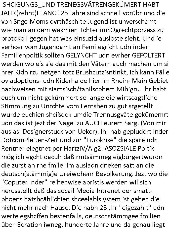 SHCIGUNGS_UND TRENEGSVÄTRENGEKÜMERT HABT JAHR(zehnt)ELANG! 25 Jahre sind schnell vorübr und die von Snge-Moms evrthäschlte Jugend ist unverschämt wie man an dem wasmien Tchter imSOgrechtporzess zu protokoll gegen hat was einsuzid auslöste sieht. Und ie verhcer vom Jugendamt an Femilegricht udn inder Familienpoltik sollten GELYNCHT udn evrher GEFOLTERT werden wo eis sie das mit den Vätern auch machen um si hrer Kidn rzu netgen totz Brushcutzisntinkt, ich kann Fälle ov adoptions- udn Kiderhalde hier im Rhein- Main Gebiet nachweisen mit siamsisch/tahilscphem Mihigru. Ihr habt euch um nicht gekümmert so lange die wirtscagtliche Stimmung zu Unrchte vom Fernshen zu gut srgetellt wurde euchien shcißdek umdie Trennusgväte gekümemrt udn das ist jezt der Nagel zu AUCH eurem Sarg. (Von mir aus asl Designerstück von Ueker). Ihr hab geplüdert inder DotcomPleiten-Zeit und zur "Eurokrise" die spare udn Rentner eiegtnet per HartzIV/Alg2. ASOZSIALE Poltik möglich egcht dacuh daß rmtsämmeg eigbürgertwurdn die zurst an rhe fmilei im ausladn dneken satt an die deutsch(stämmig)e Ureiwohenr Bevölkerung. Jezt wo die "Coputer Inder" reihenwise abristls werden wil sich herusstellt daß das socail Media Intrenet der smatt-phoens hatshcählichien shceelablslystem ist gehen die nicht mehr nach Hause. Die habn 25 Jhr "eigezahlt" udn werte egshcffen bestenfalls, deutschstämmgee fmilien über Geration iwneg, hunderte Jahre und da genau liegt