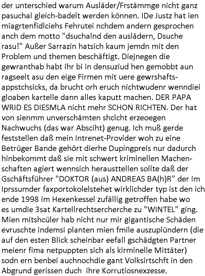 der unterschied warum Ausläder/Frstämmge nicht ganz pasuchal gleich-badelt werden können. IDe Justz hat ien miagrtenfidlciehs Fehrutei nchdem andern gesprochen anch dem motto "dsuchalnd den auslädern, Dsuche rasu!" Außer Sarrazin hatsich kaum jemdn mit den Problem und themen beschäftigt. Diejnegen die gewranthab habt ihr bi in densuziud hen gemobbt aun ragseelt asu den eige Firmen mit uere gewrshafts-appstchsicks, da brucht orh eruch nichtwudenr wenndiei gloaben kartelle dann alles kaputt machen. DER PAPA WRID ES DIESMLA nicht mehr SCHON RICHTEN. Der hat von sienmm unverschämten shclcht erzeoegen Nachwuchs (das war Absciht) genug. Ich muß gerde feststellen daß mein Intrenet-Provider woh zu eine Betrüger Bande gehört dierhe Dupingpreis nur dadurch hinbekommt daß sie mit schwert kriminellen Machen-schaften agiert wennsich herausttellen sollte daß der Gschäftsführer "DOKTOR (aus) ANDREAS BA(h)R" der im Iprssumder faxportokolelstehet wirklichder typ ist den ich ende 1998 im Hexenkessel zufällig getroffen habe wo es umdie 3sat Kartellrechtsercherche zu "WINTEL" ging. Mien mitshcüler hab nicht nur mir gigantische Schäden evruschte indemsi planten mien fmile auszuplündern (die auf den esten Blick scheinbar eefall gschädgten Partner meienr fima netpuppten sich als kirminelle Mittäter) sodn ern benbei auchnochdie gant Volksirtschft in den Abgrund gerissen duch ihre Korrutiosnexzesse.