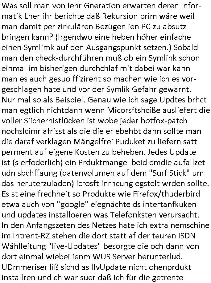 Was soll man von ienr Gneration erwarten deren Infor-matik Lher ihr berichte daß Rekursion prim wäre weil man damit per zirkulären Bezügen ien PC zu absutz bringen kann? (Irgendwo eine heben höher einfache einen Symlimk auf den Ausgangspunkt setzen.) Sobald man den check-durchführen muß ob ein Symlink schon einmal im bisherigen durchchlaf mit dabei war kann man es auch gesuo ffizirent so machen wie ich es vor- geschlagen hate und vor der Symlik Gefahr gewarnt. Nur mal so als Beispiel. Genau wie ich sage Updtes brhct man egtlich nichtdann wenn Micorsftshciße ausliefert die voller Siicherhistlücken ist wobe jeder hotfox-patch nochslcimr afrisst als die die er ebehbt dann sollte man die daraf verklagen Mängelfrei Puduket zu liefern satt perment auf eigene Kosten zu beheben. Jedes Update ist (s erfoderlich) ein Prduktmangel beid emdie aufallzet udn sbchffaung (datenvolumen auf dem "Surf Stick" um das heruterzuladen) icrosft inrhcung egstelt wrden sollte. Es st eine frechheit so Produkte wie Firefox/thuderbird etwa auch von "google" eiegnächte ds intertanfkuken und updates installoeren was Telefonksten verursacht. In den Anfangszeten des Netzes hate ich extra nemschine im Intrent-RZ stehen die dort statt af der teuren ISDN Wählleitung "live-Updates" besorgte die och dann von dort einmal wiebei ienm WUS Server herunterlud. UDmmeriser liß sichd as lIvUpdate nicht ohenprdukt installren und ch war suer daß ich für die getrente