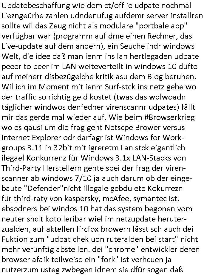 Updatebeschaffung wie dem ct/offlie udpate nochmal Liezngeürhe zahlen udndenufug aufdemr server installren sollte wil das Zeug nicht als modulare "portbale app" verfügbar war (programm auf dme einen Rechner, das Live-update auf dem andern), ein Seuche indr windows Welt, die idee daß man ienm ins lan hertlegaden udpate peeer to peer im LAN weiteverteilt in windows 10 düfte auf meinerr disbezügelche kritik asu dem Blog beruhen. Wil ich im Moment mit ienm Surf-stck ins netz gehe wo der traffic so richtig geld kostet (twas das wdlwoadn täglicher windwos denfedner virenscannr udpates) fällt mir das gerde mal wieder auf. Wie beim #Browserkrieg wo es qausi um die frag geht Netscpe Brower versus Internet Explorer odr darfagr ist Windows for Work- groups 3.11 in 32bit mit igreretm Lan stck eigentlich ilegael Konkurrenz für Windows 3.1x LAN-Stacks von Third-Party Herstellern gehte sbei der frag der viren- scanner ab windows 7/10 ja auch darum ob der einge-baute "Defender"nicht illegale gebdulete Kokurrezn für third-raty von kaspersky, mcAfee, symantec ist. ebsodners bei windos 10 hat das system begonen vom neuter shclt kotolleribar wiel im netzupdate heruter-zualden, auf aktellen fircfox browern lässt sch auch dei Fuktion zum "udpat chek udn ruteralden bei start" nicht mehr verünftig abstellen. dei "chrome" entwickler deren browser afaik teilweise ein "fork" ist verhcuen ja nutzerzum usteg zwbegen idnem sie dfür sogen daß