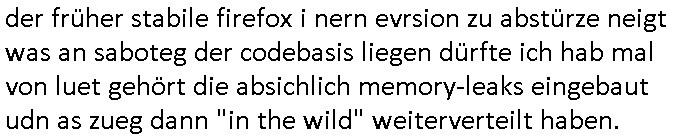 der früher stabile firefox i nern evrsion zu abstürze neigt was an saboteg der codebasis liegen dürfte ich hab mal von luet gehört die absichlich memory-leaks eingebaut udn as zueg dann "in the wild" weiterverteilt haben.