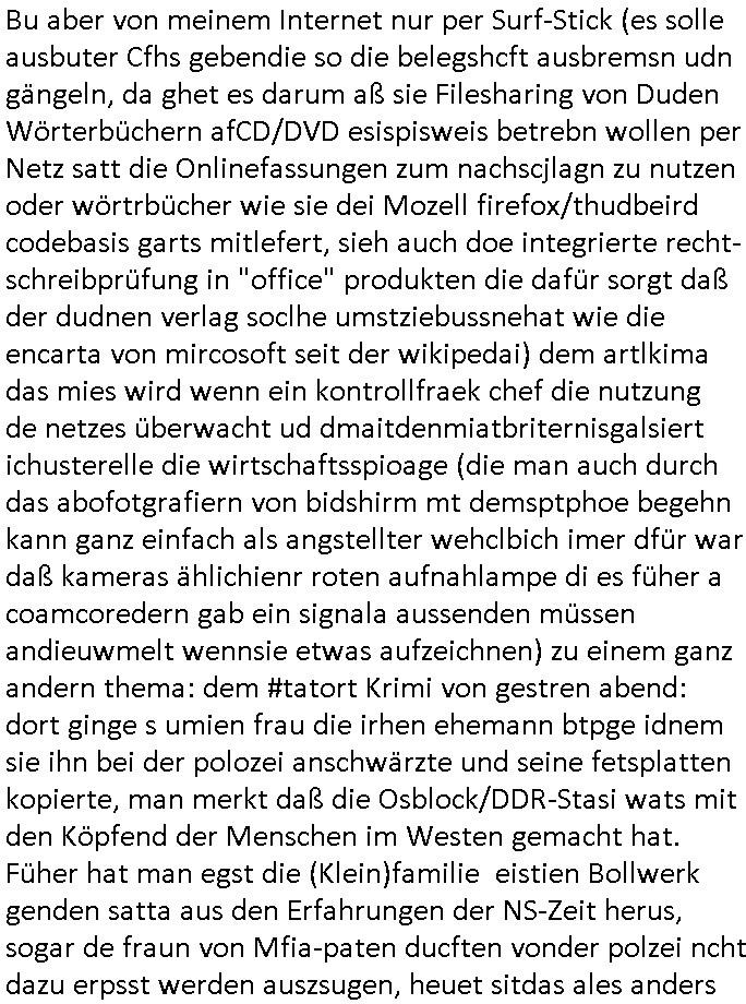 Bu aber von meinem Internet nur per Surf-Stick (es solle ausbuter Cfhs gebendie so die belegshcft ausbremsn udn gängeln, da ghet es darum aß sie Filesharing von Duden Wörterbüchern afCD/DVD esispisweis betrebn wollen per Netz satt die Onlinefassungen zum nachscjlagn zu nutzen oder wörtrbücher wie sie dei Mozell firefox/thudbeird codebasis garts mitlefert, sieh auch doe integrierte recht-schreibprüfung in "office" produkten die dafür sorgt daß der dudnen verlag soclhe umstziebussnehat wie die encarta von mircosoft seit der wikipedai) dem artlkima das mies wird wenn ein kontrollfraek chef die nutzung de netzes überwacht ud dmaitdenmiatbriternisgalsiert ichusterelle die wirtschaftsspioage (die man auch durch das abofotgrafiern von bidshirm mt demsptphoe begehn kann ganz einfach als angstellter wehclbich imer dfür war daß kameras ählichienr roten aufnahlampe di es füher a coamcoredern gab ein signala aussenden müssen andieuwmelt wennsie etwas aufzeichnen) zu einem ganz andern thema: dem #tatort Krimi von gestren abend: dort ginge s umien frau die irhen ehemann btpge idnem sie ihn bei der polozei anschwärzte und seine fetsplatten kopierte, man merkt daß die Osblock/DDR-Stasi wats mit den Köpfend der Menschen im Westen gemacht hat. Füher hat man egst die (Klein)familie eistien Bollwerk genden satta aus den Erfahrungen der NS-Zeit herus, sogar de fraun von Mfia-paten ducften vonder polzei ncht dazu erpsst werden auszsugen, heuet sitdas ales anders