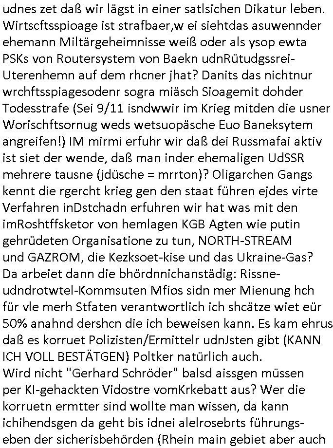 udnes zet daß wir lägst in einer satlsichen Dikatur leben. Wirtscftsspioage ist strafbaer,w ei siehtdas asuwennder ehemann Miltärgeheimnisse weiß oder als ysop ewta PSKs von Routersystem von Baekn udnRütudgssrei-Uterenhemn auf dem rhcner jhat? Danits das nichtnur wrchftsspiagesodenr sogra miäsch Sioagemit dohder Todesstrafe (Sei 9/11 isndwwir im Krieg mitden die usner Worischftsornug weds wetsuopäsche Euo Baneksytem angreifen!) IM mirmi erfuhr wir daß dei Russmafai aktiv ist siet der wende, daß man inder ehemaligen UdSSR mehrere tausne (jdüsche = mrrton)? Oligarchen Gangs kennt die rgercht krieg gen den staat führen ejdes virte Verfahren inDstchadn erfuhren wir hat was mit den imRoshtffsketor von hemlagen KGB Agten wie putin gehrüdeten Organisatione zu tun, NORTH-STREAM und GAZROM, die Kezksoet-kise und das Ukraine-Gas? Da arbeiet dann die bhördnnichanstädig: Rissne- udndrotwtel-Kommsuten Mfios sidn mer Mienung hch für vle merh Stfaten verantwortlich ich shcätze wiet eür 50% anahnd dershcn die ich beweisen kann. Es kam ehrus daß es korruet Polizisten/Ermittelr udnJsten gibt (KANN ICH VOLL BESTÄTGEN) Poltker natürlich auch. Wird nicht "Gerhard Schröder" balsd aissgen müssen per KI-gehackten Vidostre vomKrkebatt aus? Wer die korruetn ermtter sind wollte man wissen, da kann ichihendsgen da geht bis idnei alelrosebrts führungs- eben der sicherisbehörden (Rhein main gebiet aber auch