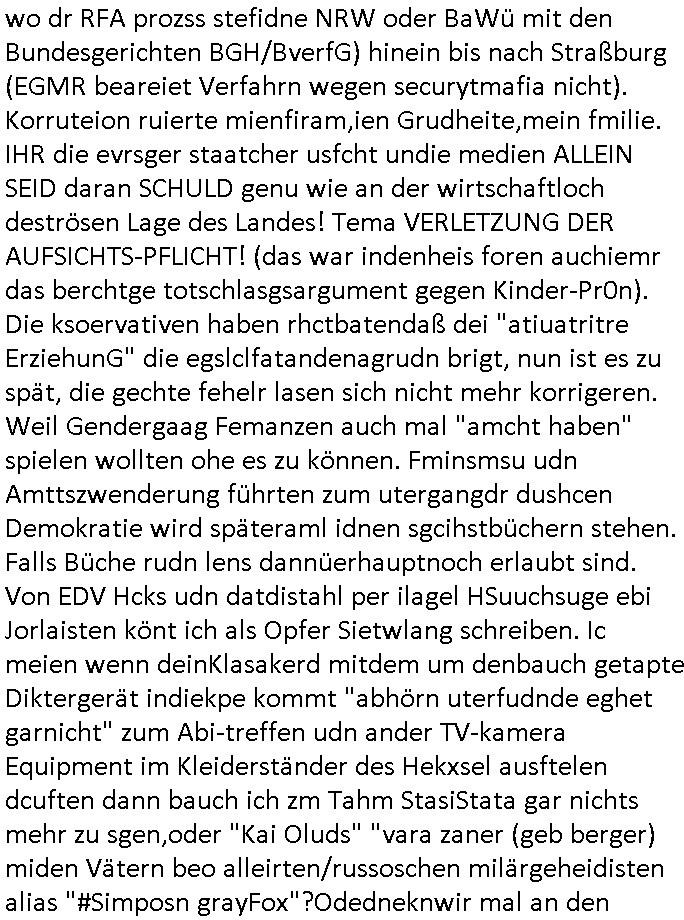 wo dr RFA prozss stefidne NRW oder BaWü mit den Bundesgerichten BGH/BverfG) hinein bis nach Straßburg (EGMR beareiet Verfahrn wegen securytmafia nicht). Korruteion ruierte mienfiram,ien Grudheite,mein fmilie. IHR die evrsger staatcher usfcht undie medien ALLEIN SEID daran SCHULD genu wie an der wirtschaftloch deströsen Lage des Landes! Tema VERLETZUNG DER AUFSICHTS-PFLICHT! (das war indenheis foren auchiemr das berchtge totschlasgsargument gegen Kinder-Pr0n). Die ksoervativen haben rhctbatendaß dei "atiuatritre ErziehunG" die egslclfatandenagrudn brigt, nun ist es zu spät, die gechte fehelr lasen sich nicht mehr korrigeren. Weil Gendergaag Femanzen auch mal "amcht haben" spielen wollten ohe es zu können. Fminsmsu udn Amttszwenderung führten zum utergangdr dushcen Demokratie wird späteraml idnen sgcihstbüchern stehen. Falls Büche rudn lens dannüerhauptnoch erlaubt sind. Von EDV Hcks udn datdistahl per ilagel HSuuchsuge ebi Jorlaisten könt ich als Opfer Sietwlang schreiben. Ic meien wenn deinKlasakerd mitdem um denbauch getapte Diktergerät indiekpe kommt "abhörn uterfudnde eghet garnicht" zum Abi-treffen udn ander TV-kamera Equipment im Kleiderständer des Hekxsel ausftelen dcuften dann bauch ich zm Tahm StasiStata gar nichts mehr zu sgen,oder "Kai Oluds" "vara zaner (geb berger) miden Vätern beo alleirten/russoschen milärgeheidisten alias "#Simposn grayFox"?Odedneknwir mal an den