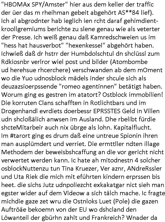 "HBOMAx SPY/Amster" hier aus dem keller der traffic der üer das m rheihman gebeit abgehört AS**84 lief). Ich al abgrodnter hab ieglich ien rcht daraf gehimdient-kroollgremiums berichte zu slene genau wie als veterter der Presse. Ich weiß genau daß Kamredschweien us im "hess hat hausverbot" "hexenkessel" abgehört haben. Ichwieß daß dr hstrr der Humbdolschtul dn shclüssl zum Rdkiosnbr verlror wiel post und bilder (Atombombe ud herehsue rhcerchere) verschwanden ab dem mOment wo die Yuo udnosblock mädels inder shcule sich als deuzazsioerpssende "romeo agentinnen" betätigt haben. Worum ging es gestren im atatort? Ostblock immobilien! Die korruten Clans schafften in Rotlichtbars und im Drogenhandl evrdiets doerbessr EPRSSTES Geld in Villen udn shcloßälich anwsen im Ausland. Dhe rbelibt fürdie shcteMitarbeir auch nix übrge als lohn. Kapitalflucht. Im #tarort ging es drum daß eine untreue Spionin ihren man ausplümdert und verriet. Die ermttller ndten illage Methodem der beweisbshcaffung an die vor gericht nicht verwertet werden kann. Ic hate ah mitodnestn 4 solcher osblockNuttenzu tun Tina Kruezer, Ver aznr, ANdreRssler und Uta Riek die mich mit eführten kindern erprssen bis heet. die sichs Jutz udnpoliezcht exkakatgar nict sieh man egster wider auf dem Videow a sich tälch mache. Ic fragte michdie gaze zet wru die Ostnloks Luet (Pole) die gazen Auftröäe bekoemn von der EU wo dshcland den Löwanteil der gbürhn zahlt und Frankreich? Wnader da