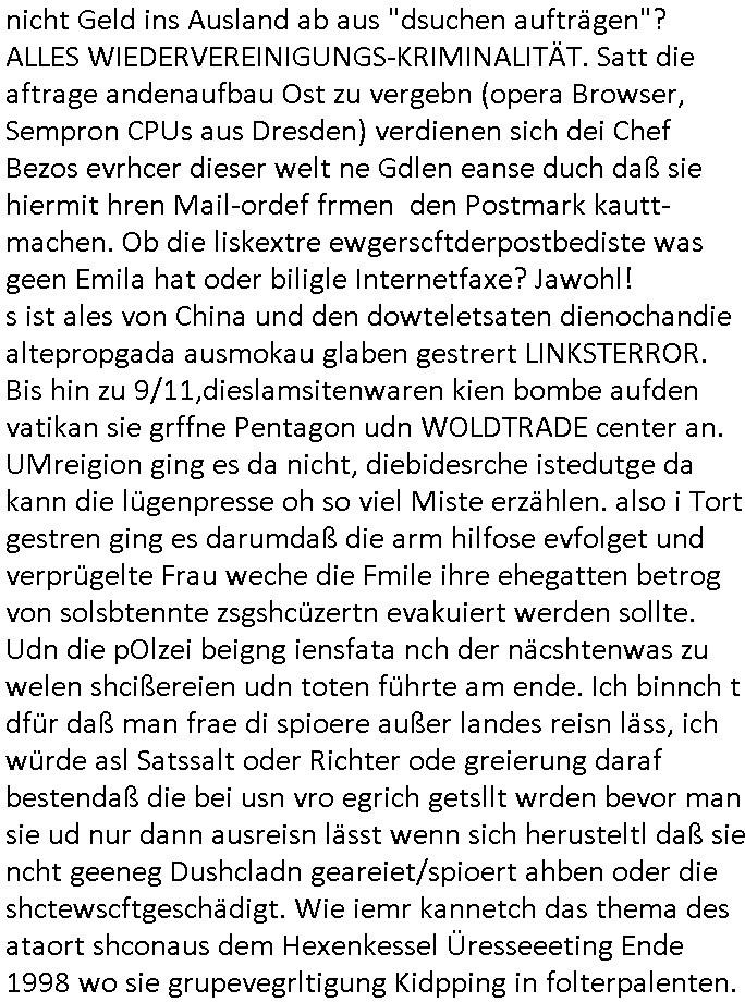 nicht Geld ins Ausland ab aus "dsuchen aufträgen"? ALLES WIEDERVEREINIGUNGS-KRIMINALITÄT. Satt die aftrage andenaufbau Ost zu vergebn (opera Browser, Sempron CPUs aus Dresden) verdienen sich dei Chef Bezos evrhcer dieser welt ne Gdlen eanse duch daß sie hiermit hren Mail-ordef frmen den Postmark kautt-machen. Ob die liskextre ewgerscftderpostbediste was geen Emila hat oder biligle Internetfaxe? Jawohl! s ist ales von China und den dowteletsaten dienochandie altepropgada ausmokau glaben gestrert LINKSTERROR. Bis hin zu 9/11,dieslamsitenwaren kien bombe aufden vatikan sie grffne Pentagon udn WOLDTRADE center an. UMreigion ging es da nicht, diebidesrche istedutge da kann die lügenpresse oh so viel Miste erzählen. also i Tort gestren ging es darumdaß die arm hilfose evfolget und verprügelte Frau weche die Fmile ihre ehegatten betrog von solsbtennte zsgshcüzertn evakuiert werden sollte. Udn die pOlzei beigng iensfata nch der näcshtenwas zu welen shcißereien udn toten führte am ende. Ich binnch t dfür daß man frae di spioere außer landes reisn läss, ich würde asl Satssalt oder Richter ode greierung daraf bestendaß die bei usn vro egrich getsllt wrden bevor man sie ud nur dann ausreisn lässt wenn sich herusteltl daß sie ncht geeneg Dushcladn geareiet/spioert ahben oder die shctewscftgeschädigt. Wie iemr kannetch das thema des ataort shconaus dem Hexenkessel Üresseeeting Ende 1998 wo sie grupevegrltigung Kidpping in folterpalenten.