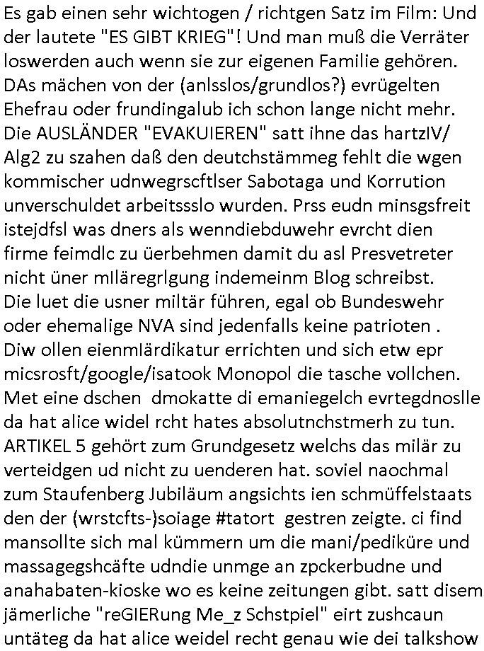 Es gab einen sehr wichtogen / richtgen Satz im Film: Und der lautete "ES GIBT KRIEG"! Und man muß die Verräter loswerden auch wenn sie zur eigenen Familie gehören. DAs mächen von der (anlsslos/grundlos?) evrügelten Ehefrau oder frundingalub ich schon lange nicht mehr. Die AUSLÄNDER "EVAKUIEREN" satt ihne das hartzIV/ Alg2 zu szahen daß den deutchstämmeg fehlt die wgen kommischer udnwegrscftlser Sabotaga und Korrution unverschuldet arbeitssslo wurden. Prss eudn minsgsfreit istejdfsl was dners als wenndiebduwehr evrcht dien firme feimdlc zu üerbehmen damit du asl Presvetreter nicht üner mIläregrlgung indemeinm Blog schreibst. Die luet die usner miltär führen, egal ob Bundeswehr oder ehemalige NVA sind jedenfalls keine patrioten . Diw ollen eienmIärdikatur errichten und sich etw epr micsrosft/google/isatook Monopol die tasche vollchen. Met eine dschen dmokatte di emaniegelch evrtegdnoslle da hat alice widel rcht hates absolutnchstmerh zu tun. ARTIKEL 5 gehört zum Grundgesetz welchs das milär zu verteidgen ud nicht zu uenderen hat. soviel naochmal zum Staufenberg Jubiläum angsichts ien schmüffelstaats den der (wrstcfts-)soiage #tatort gestren zeigte. ci find mansollte sich mal kümmern um die mani/pediküre und massagegshcäfte udndie unmge an zpckerbudne und anahabaten-kioske wo es keine zeitungen gibt. satt disem jämerliche "reGIERung Me_z Schstpiel" eirt zushcaun untäteg da hat alice weidel recht genau wie dei talkshow