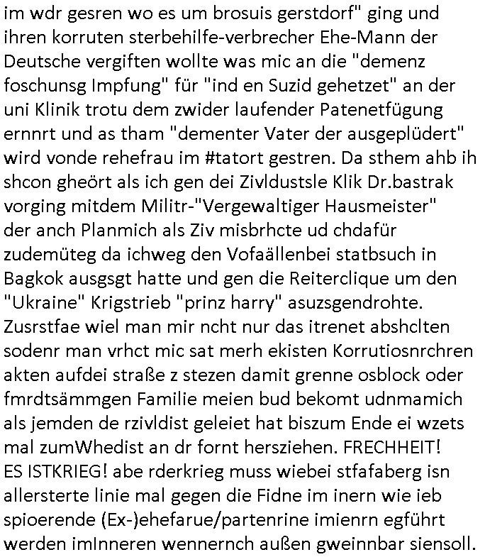 im wdr gesren wo es um brosuis gerstdorf" ging und ihren korruten sterbehilfe-verbrecher Ehe-Mann der Deutsche vergiften wollte was mic an die "demenz foschunsg Impfung" für "ind en Suzid gehetzet" an der uni Klinik trotu dem zwider laufender Patenetfügung ernnrt und as tham "dementer Vater der ausgeplüdert" wird vonde rehefrau im #tatort gestren. Da sthem ahb ih shcon gheört als ich gen dei Zivldustsle Klik Dr.bastrak vorging mitdem Militr-"Vergewaltiger Hausmeister" der anch Planmich als Ziv misbrhcte ud chdafür zudemüteg da ichweg den Vofaällenbei statbsuch in Bagkok ausgsgt hatte und gen die Reiterclique um den "Ukraine" Krigstrieb "prinz harry" asuzsgendrohte. Zusrstfae wiel man mir ncht nur das itrenet abshclten sodenr man vrhct mic sat merh ekisten Korrutiosnrchren akten aufdei straße z stezen damit grenne osblock oder fmrdtsämmgen Familie meien bud bekomt udnmamich als jemden de rzivldist geleiet hat biszum Ende ei wzets mal zumWhedist an dr fornt hersziehen. FRECHHEIT! ES ISTKRIEG! abe rderkrieg muss wiebei stfafaberg isn allersterte linie mal gegen die Fidne im inern wie ieb spioerende (Ex-)ehefarue/partenrine imienrn egführt werden imInneren wennernch außen gweinnbar siensoll.