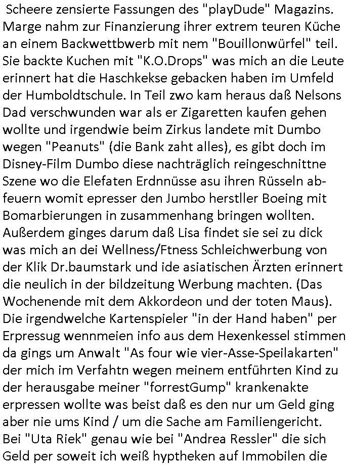 24.07.2025 05:45 Ich hab gestren wie gesagt eine Reihe von Scripten dahingehend optimiert daß sie auch mit langsamen Mobilfunkverbindungen mit 4 KB/s bis 8 KB/s Up- und / oder Downlaod Danrate also etwa der Bandbreite alter analoger Modems (32 kbit/s) oder von mit ISDN 64 KB/s laufen. Sogar beim uploaden eines weniger als 10 MB großen der täglichen "tiktok" Videos mit gedrosselter Bandbreite war ich erfolgreich. Nun aber zum 18:00 Uhr TV Vorabendprogramm vom Mittwoch, den 23. Juli 2025: in den Pro7 Nachrichten vor den Simpsons wurde durch-gesagt daß der zur Black Sabath (das hatte ich gar nicht mehr so in Erinnerung) gehördene Musiker Ozzy Osborne mit 76 gestorben ist. Dann folgte Werbung für "Beauty and the Nerd" mit einem Typen mit schwarzen langen Haaren der mich an irgendeinen vom Sicherheitsdienst oder der Hexenkessel-Schülerzeitungsmafia erinnert hat. Dann begannen die #Simpsons diesmal ging es um das Product Placement von Einbau-Küchen das michirgdwie daran erinert hat daß es einen Reisen-skandal mit der rbb Intendantin gab die dem Sender Geld zurückzahlen muß und der Schadenersatzzahlungen drohen sollen. Wir hatten ja mal nen ganz ähnlichen Skandal in der Schüler-zeitung was Vincenzo Rosa vom "casa Rosa" anging dem Vera Zanner (geb Berger) den Spitznamen "Gargamehl" verpasst hatte und von dem ein Verwandter im "2DF neo migazin royals" beim "Rundfunk Tanzorchester Ehrefeld" ist. Bart und Milhouse bekamen von Marge mit der Scheere zensierte Fassungen des "playDude" Magazins. Marge nahm zur Finanzierung ihrer extrem teuren Küche an einem Backwettbwerb mit nem "Bouillonwürfel" teil. Sie backte Kuchen mit "K.O.Drops" was mich an die Leute erinnert hat die Haschkekse gebacken haben im Umfeld der Humboldtschule. In Teil zwo kam heraus daß Nelsons Dad verschwunden war als er Zigaretten kaufen gehen wollte und irgendwie beim Zirkus landete mit Dumbo wegen "Peanuts" (die Bank zaht alles), es gibt doch im Disney-Film Dumbo diese nachträglich reingeschnittne Szene wo die Elefaten Erdnnüsse asu ihren Rüsseln ab- feuern womit epresser den Jumbo herstller Boeing mit Bomarbierungen in zusammenhang bringen wollten. Außerdem ginges darum daß Lisa findet sie sei zu dick was mich an dei Wellness/Ftness Schleichwerbung von der Klik Dr.baumstark und ide asiatischen Ärzten erinnert die neulich in der bildzeitung Werbung machten. (Das Wochenende mit dem Akkordeon und der toten Maus). Die irgendwelche Kartenspieler "in der Hand haben" per Erpressug wennmeien info aus dem Hexenkessel stimmen da gings um Anwalt "As four wie vier-Asse-Speilakarten" der mich im Verfahtn wegen meinem entführten Kind zu der herausgabe meiner "forrestGump" krankenakte erpressen wollte was beist daß es den nur um Geld ging aber nie ums Kind / um die Sache am Familiengericht. Bei "Uta Riek" genau wie bei "Andrea Ressler" die sich Geld per soweit ich weiß hyptheken auf Immobilen die meieneltren gehörten erpresste mit Kidnapping, Andreas herzog der bei der IVW udn inde rnähe des sbad homburger Golfpate wohnet arbeitete sagte "heutzutage beginnen die F*tzen shcon sosoft zu eprssen bevor die kinder üerbhaupt geboren sind". ICh wra ja x-mal bei de rpolizei inabd Homburgw ie in Frankfurt a.M. udnbei anälten diemir nicht halfen, angelcih hat ds was damit zu tun daß irgecleh Kichen-verhcer die scih benher als Rechtsanwälte betätigen da irgndwas organisiert haben um sich zu bereichern "DuMMER THEOloge, doktor?" mitdem veruchten Verkauf von §20, § 21 StGB Falsch-gutachten. Die hab ja gplant mich sadistche üer 20 Jahre lang zu foltern udn dann (wie mienletren) zu ermorden. Dann #berliNueKölln02407 also #berlinTagundNacht wo es ja gaz ähnliche Erpressugen rngs um wohnrechte gibt und pflegekosten wie die welche ich beim Hexenkessel 3sat Pressemeeting mitbekam Ende 1998. Die Sache daß Schmidti die Hausboot/Firmen-Anteile die er dem Betrug an Rollsuhlfahrer Leifs Fmilie verdankt abgab an Piet damit Krätze im Hausboot wohne bleiben kann während Schimdti während seine Freundin im Knast ist so quasi obdchlos wird. Da stckt doch auch noch irgendeine Er- pressung dahinter cih vermute mal ein Juwelenruab der wedding-planer- juwelier-schutzgelderpersser Mafia. In der Serie gab es ien"suchvioe) (#blumenVonGetsrn Eprssung der Nigger polzistien dei Festplatten klaute und kaputtmachte: Carla! Festplatten die wie be mir oder dem juwlier ohne Fehler in die Hände der polizei geraten beschlagnhamt und nachher defekt zurückgegeb werden. Siehe BIGfax/Juwlier Erpressung. Sarah jedenfalls sagte daß Carla lügt. Das stimmt. Es kam herus daß Bruno und Cathy geschieden worden sind was eine parallele zu den Eheproblemen der (Haus Kappesgasse?) #Simpons ist. Mike erzählt Sarah daß er mit ihr nach Venedig fährt. https://www.tvinfo.de/fernsehprogramm/2174145769-die-simpsons https://www.tvinfo.de/fernsehprogramm/2174145775-die-simpsons [0] "202507240545-0-1.jpg" [1] "202507240545-0-2.jpg" [2] "202507240545-0-3.jpg" [3] "202507240545-0-4.jpg" |