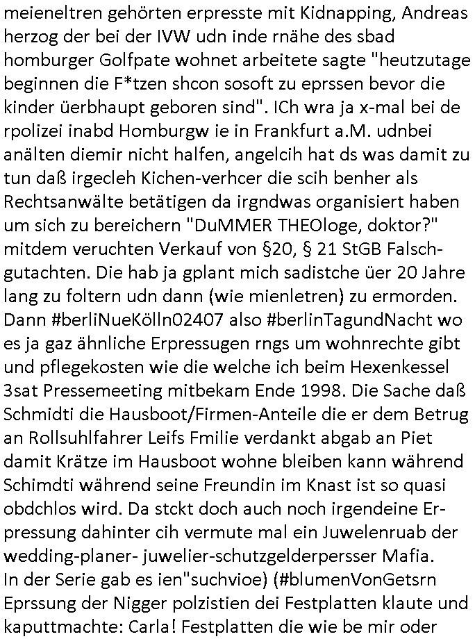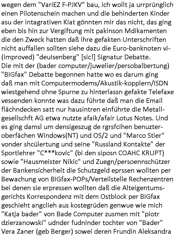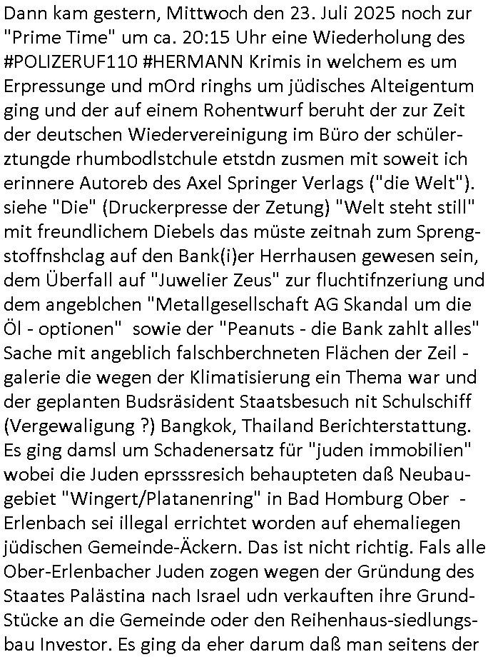 24.07.2025 06:00 Dann kam gestern, Mittwoch den 23. Juli 2025 noch zur "Prime Time" um ca. 20:15 Uhr eine Wiederholung des #POLIZERUF110 #HERMANN Krimis in welchem es um Erpressunge und mOrd ringhs um jüdisches Alteigentum ging und der auf einem Rohentwurf beruht der zur Zeit der deutschen Wiedervereinigung im Büro der schüler-ztungde rhumbodlstchule etstdn zusmen mit soweit ich erinnere Autoreb des Axel Springer Verlags ("die Welt"). siehe "Die" (Druckerpresse der Zetung) "Welt steht still" mit freundlichem Diebels das müste zeitnah zum Spreng-stoffnshclag auf den Bank(i)er Herrhausen gewesen sein, dem Überfall auf "Juwelier Zeus" zur fluchtifnzeriung und dem angeblchen "Metallgesellschaft AG Skandal um die Öl - optionen" sowie der "Peanuts - die Bank zahlt alles" Sache mit angeblich falschberchneten Flächen der Zeil - galerie die wegen der Klimatisierung ein Thema war und der geplanten Budsräsident Staatsbesuch nit Schulschiff (Vergewaligung ?) Bangkok, Thailand Berichterstattung. Es ging damsl um Schadenersatz für "juden immobilien" wobei die Juden eprsssresich behaupteten daß Neubau-gebiet "Wingert/Platanenring" in Bad Homburg Ober - Erlenbach sei illegal errichtet worden auf ehemaliegen jüdischen Gemeinde-Äckern. Das ist nicht richtig. Fals alle Ober-Erlenbacher Juden zogen wegen der Gründung des Staates Palästina nach Israel udn verkauften ihre Grund-Stücke an die Gemeinde oder den Reihenhaus-siedlungs- bau Investor. Es ging da eher darum daß man seitens der Juden das zu Unrecht behauptet hatte um so die Kidner vor dem heragezogen werden zum Wehrdienst in Israel beim Militär zu verstecken. Das ging soweit daß sie mch dazu bringen wollten mit den betrügern Identitäten zu stchen üer den trick gafkter pressausweise udn erprssung mienr zivldiststelel de rklik Dr. baustark sowie entührung von Kindern sowie der Bedrohung meiner Familie mit Verstümmlung/Tod. Siehe das them im Krimi gestern wo ein Mann aus ienm KOMMUNISTEN Kibbuz ankam und evrhcte anspruch auf Immobilen zu erheben udndamit einen 50 Mio Euro Immobilendeal gfärtdete, nälichden des ehemalgen Kozergelädes der Metallegselslcft AG im Reuterwge hindet de rlaten Oper in Frankfurt a.M.. ICh eriner mich auch noch wie manmir mal ezrählet daß die Reihenhaussiedlung ursprünglich von der "DESIGN" Fima "BRAUN" (Wecker, Hifi-Alagen) aus Kronberg/Ts. geplant worden war asl Wrkswohnugen für Mitarbeiter in d rkita, ebenso wie eine bauglche Siedlung in der Tannenwaldallee die beide wie eine mitalerlich Burg mit hohen Mauern gebaut und daher für VIPs prädsstiniert sind, es lbtenda ja mehre piloten vom Flughafen etwa. Ich eriner mich auch noch wie meine Mutter sich damals für den stdort Ober-Erlbch enstcdie wegn der Gymnastik dei Turnhalle und Kita boten und der größeren Nähe zu Frankfurt a.M. als andere Stadteile Bad Homburgs. Krankengymastik um meine leichten Spasmen wegzu-trainiern war wichtig da gab es auch irgendwlchen Zoff wegen dem "VariEZ F-PJKV" bau, ich wollt ja urrprünglich einen Pilotenschein machen und die behinderten Kinder asu der intagrativen Kiat gönnten mir das nicht, das ging eben bis hin zur Vergiftung mit pakinson Mdikamenten die den Zweck hatten daß ihre gefakten Unterschriften nicht auffallen sollten siehe dazu die Euro-banknoten vi-(improved) "deuIsenberg" [sic!] Signatur Debatte. Die mit der (bader computer/juwelier/persobalbertung) "BIGfax" Debatte begonnen hatte wo es darum ging daß man mit Computermodems/Akustik-kopplern/ISDN wiestgehend ohne Spurne zu hinterlassn gefakte Telefaxe vessenden konnte was dazu führte daß man die Email flächndecken satt nur hausintren einführte die Metall- gesellschft AG etwa nutzte afaik/afair Lotus Notes. Und es ging damsl um densigeszug de rgrsfcihen benuzter-oberfächen Windows(NT) und OS/2 und "Marco Stier" vonder shcülertung und seine "Russland Kontakte" der Sportlehrer "C***kovic" (bi den siposn COAHC KRUPT) sowie "Hausmeister Nikic" und Zuegn/persoennschützer der Bankensicherheit die Schutzgeld eprssen wollten per Bewachung von BIGfax-POPs/Verteilstelle Rechenzentren bei denen sie erpressen wollten daß die Alteigentums- gerichts Korrespondenz mit dem Ostblock per BIGfax geschieht angclieh aus kostegrüden genwue wie mich "Katja bader" von Bade Computer zusmen mit "piotr dzierzanowski" udnder fudninder tochter von "Bader" Vera Zaner (geb Berger) sowei deren Frundin Aleksandra Roljic mich erpressten: ich sollt das Produkt den banken und dem Rohstffokoerzenr wo mien Eltern abeitete aufschwätzen was ich slbstvertsädlich unterließ. Die Osblock Kommunisten udngerlscftsappstchcik planten dann die Unterlagen zu vertauschen in den PDF-Fax- Qeues um so vonStalin enteignete Immobilen zu erbeuten die dann nicht zurückgegebn werden. Udn genau ds istinahlt des #Polzeruf110 #herman Krimis. Mit vertauschten udn gefäschten und verschwindenden Dokumenten Immobilenetgeunersich zu erpressen. https://www.tvinfo.de/fernsehprogramm/2157232308-polizeiruf-110-hermann [0] "202507240600-0-1.jpg" [1] "202507240600-0-2.jpg" [2] "202507240600-0-3.jpg" [3] "202507240600-0-4.jpg" |