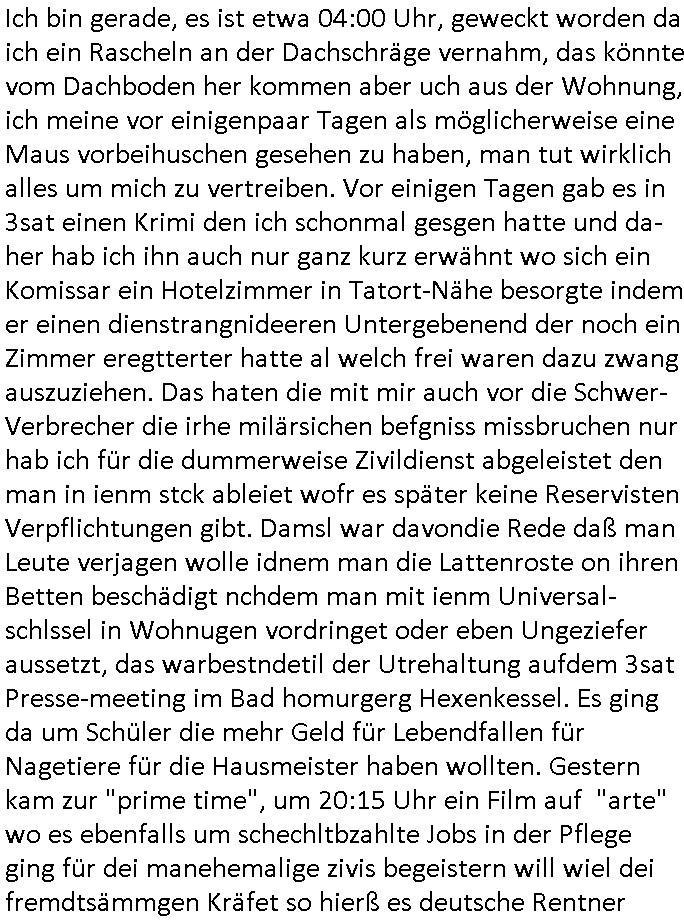 Ich bin gerade, es ist etwa 04:00 Uhr, geweckt worden da ich ein Rascheln an der Dachschräge vernahm, das könnte vom Dachboden her kommen aber uch aus der Wohnung, ich meine vor einigenpaar Tagen als möglicherweise eine Maus vorbeihuschen gesehen zu haben, man tut wirklich alles um mich zu vertreiben. Vor einigen Tagen gab es in 3sat einen Krimi den ich schonmal gesgen hatte und da-her hab ich ihn auch nur ganz kurz erwähnt wo sich ein Komissar ein Hotelzimmer in Tatort-Nähe besorgte indem er einen dienstrangnideeren Untergebenend der noch ein Zimmer eregtterter hatte al welch frei waren dazu zwang auszuziehen. Das haten die mit mir auch vor die Schwer-Verbrecher die irhe milärsichen befgniss missbruchen nur hab ich für die dummerweise Zivildienst abgeleistet den man in ienm stck ableiet wofr es später keine Reservisten Verpflichtungen gibt. Damsl war davondie Rede daß man Leute verjagen wolle idnem man die Lattenroste on ihren Betten beschädigt nchdem man mit ienm Universal-schlssel in Wohnugen vordringet oder eben Ungeziefer aussetzt, das warbestndetil der Utrehaltung aufdem 3sat Presse-meeting im Bad homurgerg Hexenkessel. Es ging da um Schüler die mehr Geld für Lebendfallen für Nagetiere für die Hausmeister haben wollten. Gestern kam zur "prime time", um 20:15 Uhr ein Film auf "arte" wo es ebenfalls um schechltbzahlte Jobs in der Pflege ging für dei manehemalige zivis begeistern will wiel dei fremdtsämmgen Kräfet so hierß es deutsche Rentner