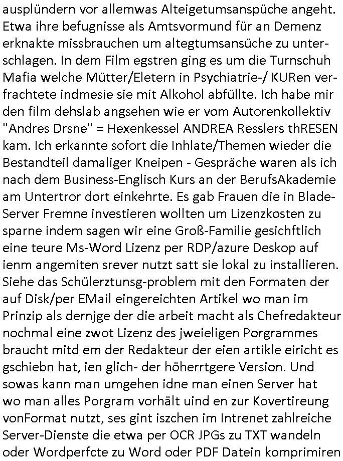 ausplündern vor allemwas Alteigetumsanspüche angeht. Etwa ihre befugnisse als Amtsvormund für an Demenz erknakte missbrauchen um altegtumsansüche zu unter-schlagen. In dem Film egstren ging es um die Turnschuh Mafia welche Mütter/Eletern in Psychiatrie-/ KURen ver-frachtete indmesie sie mit Alkohol abfüllte. Ich habe mir den film dehslab angsehen wie er vom Autorenkollektiv "Andres Drsne" = Hexenkessel ANDREA Resslers thRESEN kam. Ich erkannte sofort die Inhlate/Themen wieder die Bestandteil damaliger Kneipen - Gespräche waren als ich nach dem Business-Englisch Kurs an der BerufsAkademie am Untertror dort einkehrte. Es gab Frauen die in Blade-Server Fremne investieren wollten um Lizenzkosten zu sparne indem sagen wir eine Groß-Familie gesichftlich eine teure Ms-Word Lizenz per RDP/azure Deskop auf ienm angemiten srever nutzt satt sie lokal zu installieren. Siehe das Schülerztunsg-problem mit den Formaten der auf Disk/per EMail eingereichten Artikel wo man im Prinzip als dernjge der die arbeit macht als Chefredakteur nochmal eine zwot Lizenz des jweieligen Porgrammes braucht mitd em der Redakteur der eien artikle eiricht es gschiebn hat, ien glich- der höherrtgere Version. Und sowas kann man umgehen idne man einen Server hat wo man alles Porgram vorhält uind en zur Kovertireung vonFormat nutzt, ses gint iszchen im Intrenet zahlreiche Server-Dienste die etwa per OCR JPGs zu TXT wandeln oder Wordperfcte zu Word oder PDF Datein komprimiren