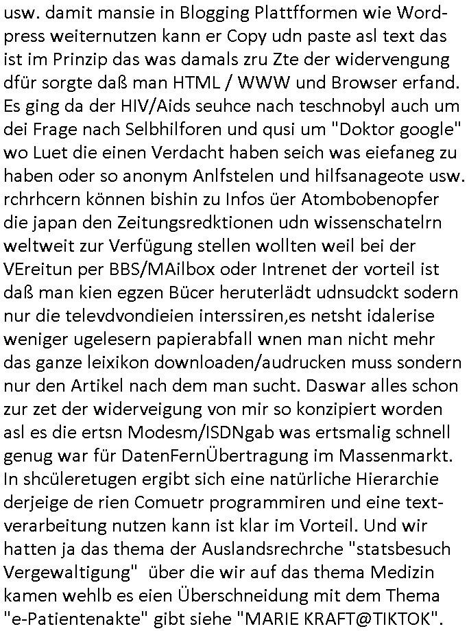 usw. damit mansie in Blogging Plattfformen wie Word-press weiternutzen kann er Copy udn paste asl text das ist im Prinzip das was damals zru Zte der widervengung dfür sorgte daß man HTML / WWW und Browser erfand. Es ging da der HIV/Aids seuhce nach teschnobyl auch um dei Frage nach Selbhilforen und qusi um "Doktor google" wo Luet die einen Verdacht haben seich was eiefaneg zu haben oder so anonym Anlfstelen und hilfsanageote usw. rchrhcern können bishin zu Infos üer Atombobenopfer die japan den Zeitungsredktionen udn wissenschatelrn weltweit zur Verfügung stellen wollten weil bei der VEreitun per BBS/MAilbox oder Intrenet der vorteil ist daß man kien egzen Bücer heruterlädt udnsudckt sodern nur die televdvondieien interssiren,es netsht idalerise weniger ugelesern papierabfall wnen man nicht mehr das ganze leixikon downloaden/audrucken muss sondern nur den Artikel nach dem man sucht. Daswar alles schon zur zet der widerveigung von mir so konzipiert worden asl es die ertsn Modesm/ISDNgab was ertsmalig schnell genug war für DatenFernÜbertragung im Massenmarkt. In shcüleretugen ergibt sich eine natürliche Hierarchie derjeige de rien Comuetr programmiren und eine text-verarbeitung nutzen kann ist klar im Vorteil. Und wir hatten ja das thema der Auslandsrechrche "statsbesuch Vergewaltigung" über die wir auf das thema Medizin kamen wehlb es eien Überschneidung mit dem Thema "e-Patientenakte" gibt siehe "MARIE KRAFT@TIKTOK".