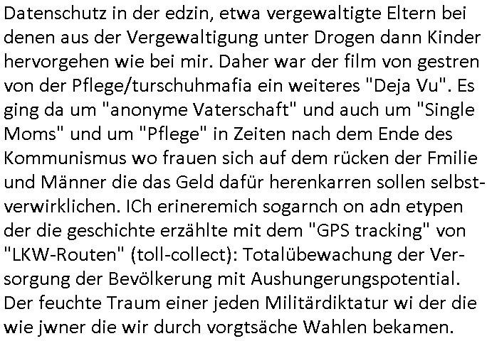 Datenschutz in der edzin, etwa vergewaltigte Eltern bei denen aus der Vergewaltigung unter Drogen dann Kinder hervorgehen wie bei mir. Daher war der film von gestren von der Pflege/turschuhmafia ein weiteres "Deja Vu". Es ging da um "anonyme Vaterschaft" und auch um "Single Moms" und um "Pflege" in Zeiten nach dem Ende des Kommunismus wo frauen sich auf dem rücken der Fmilie und Männer die das Geld dafür herenkarren sollen selbst-verwirklichen. ICh erineremich sogarnch on adn etypen der die geschichte erzählte mit dem "GPS tracking" von "LKW-Routen" (toll-collect): Totalübewachung der Ver- sorgung der Bevölkerung mit Aushungerungspotential. Der feuchte Traum einer jeden Militärdiktatur wi der die wie jwner die wir durch vorgtsäche Wahlen bekamen.
