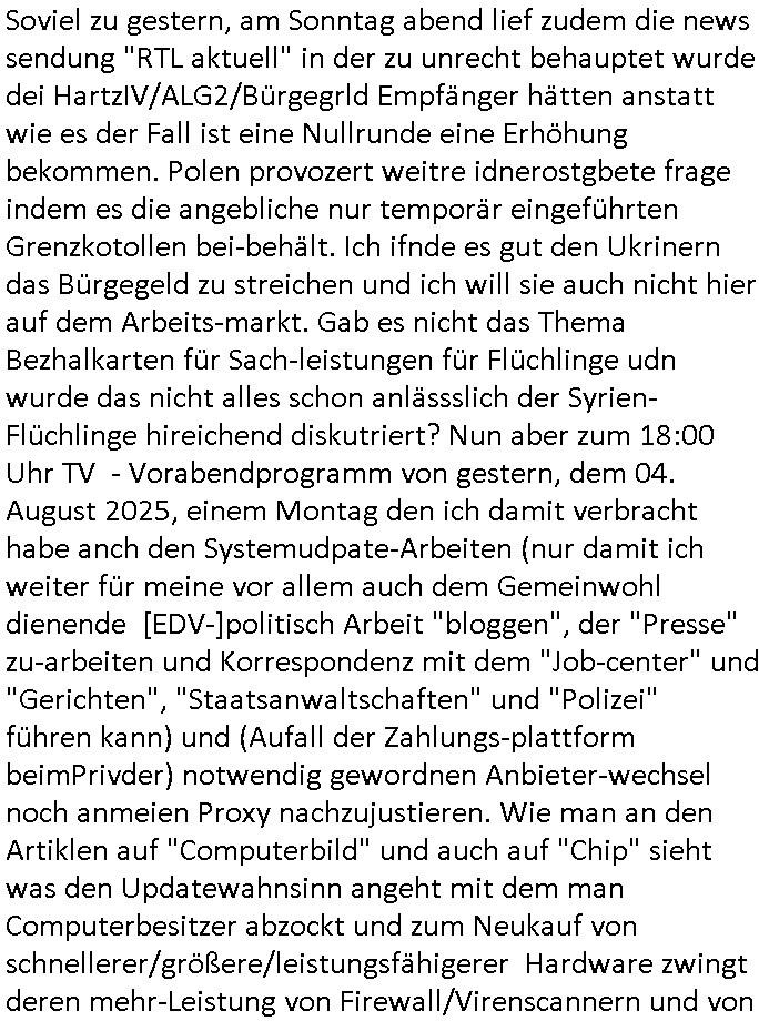 Soviel zu gestern, am Sonntag abend lief zudem die news sendung "RTL aktuell" in der zu unrecht behauptet wurde dei HartzIV/ALG2/Bürgegrld Empfänger hätten anstatt wie es der Fall ist eine Nullrunde eine Erhöhung bekommen. Polen provozert weitre idnerostgbete frage indem es die angebliche nur temporär eingeführten Grenzkotollen bei-behält. Ich ifnde es gut den Ukrinern das Bürgegeld zu streichen und ich will sie auch nicht hier auf dem Arbeits-markt. Gab es nicht das Thema Bezhalkarten für Sach-leistungen für Flüchlinge udn wurde das nicht alles schon anlässslich der Syrien-Flüchlinge hireichend diskutriert? Nun aber zum 18:00 Uhr TV - Vorabendprogramm von gestern, dem 04. August 2025, einem Montag den ich damit verbracht habe anch den Systemudpate-Arbeiten (nur damit ich weiter für meine vor allem auch dem Gemeinwohl dienende [EDV-]politisch Arbeit "bloggen", der "Presse" zu-arbeiten und Korrespondenz mit dem "Job-center" und "Gerichten", "Staatsanwaltschaften" und "Polizei" führen kann) und (Aufall der Zahlungs-plattform beimPrivder) notwendig gewordnen Anbieter-wechsel noch anmeien Proxy nachzujustieren. Wie man an den Artiklen auf "Computerbild" und auch auf "Chip" sieht was den Updatewahnsinn angeht mit dem man Computerbesitzer abzockt und zum Neukauf von schnellerer/größere/leistungsfähigerer Hardware zwingt deren mehr-Leistung von Firewall/Virenscannern und von