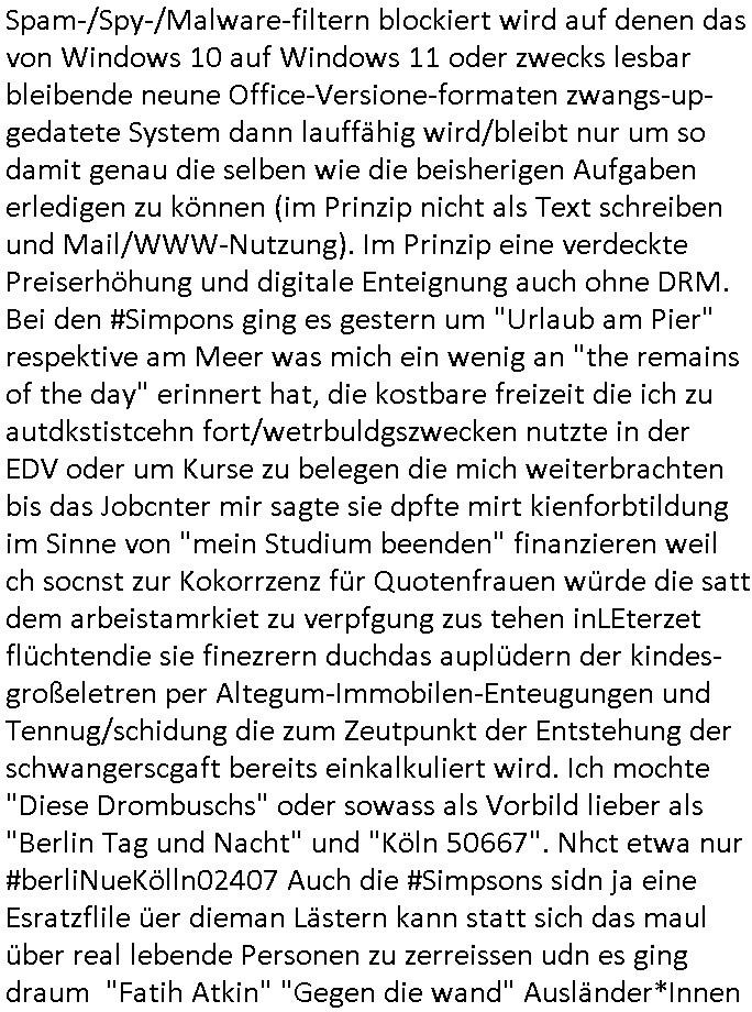 Spam-/Spy-/Malware-filtern blockiert wird auf denen das von Windows 10 auf Windows 11 oder zwecks lesbar bleibende neune Office-Versione-formaten zwangs-up-gedatete System dann lauffähig wird/bleibt nur um so damit genau die selben wie die beisherigen Aufgaben erledigen zu können (im Prinzip nicht als Text schreiben und Mail/WWW-Nutzung). Im Prinzip eine verdeckte Preiserhöhung und digitale Enteignung auch ohne DRM. Bei den #Simpons ging es gestern um "Urlaub am Pier" respektive am Meer was mich ein wenig an "the remains of the day" erinnert hat, die kostbare freizeit die ich zu autdkstistcehn fort/wetrbuldgszwecken nutzte in der EDV oder um Kurse zu belegen die mich weiterbrachten bis das Jobcnter mir sagte sie dpfte mirt kienforbtildung im Sinne von "mein Studium beenden" finanzieren weil ch socnst zur Kokorrzenz für Quotenfrauen würde die satt dem arbeistamrkiet zu verpfgung zus tehen inLEterzet flüchtendie sie finezrern duchdas auplüdern der kindes-großeletren per Altegum-Immobilen-Enteugungen und Tennug/schidung die zum Zeutpunkt der Entstehung der schwangerscgaft bereits einkalkuliert wird. Ich mochte "Diese Drombuschs" oder sowass als Vorbild lieber als "Berlin Tag und Nacht" und "Köln 50667". Nhct etwa nur #berliNueKölln02407 Auch die #Simpsons sidn ja eine Esratzflile üer dieman Lästern kann statt sich das maul über real lebende Personen zu zerreissen udn es ging draum "Fatih Atkin" "Gegen die wand" Ausländer*Innen