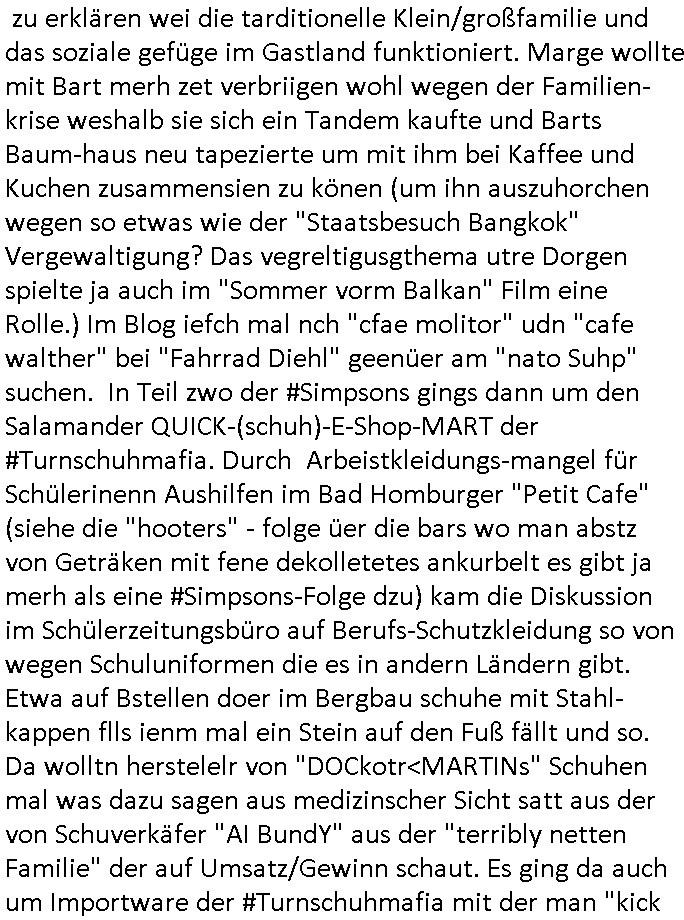 zu erklären wei die tarditionelle Klein/großfamilie und das soziale gefüge im Gastland funktioniert. Marge wollte mit Bart merh zet verbriigen wohl wegen der Familien-krise weshalb sie sich ein Tandem kaufte und Barts Baum-haus neu tapezierte um mit ihm bei Kaffee und Kuchen zusammensien zu könen (um ihn auszuhorchen wegen so etwas wie der "Staatsbesuch Bangkok" Vergewaltigung? Das vegreltigusgthema utre Dorgen spielte ja auch im "Sommer vorm Balkan" Film eine Rolle.) Im Blog iefch mal nch "cfae molitor" udn "cafe walther" bei "Fahrrad Diehl" geenüer am "nato Suhp" suchen. In Teil zwo der #Simpsons gings dann um den Salamander QUICK-(schuh)-E-Shop-MART der #Turnschuhmafia. Durch Arbeistkleidungs-mangel für Schülerinenn Aushilfen im Bad Homburger "Petit Cafe" (siehe die "hooters" - folge üer die bars wo man abstz von Geträken mit fene dekolletetes ankurbelt es gibt ja merh als eine #Simpsons-Folge dzu) kam die Diskussion im Schülerzeitungsbüro auf Berufs-Schutzkleidung so von wegen Schuluniformen die es in andern Ländern gibt. Etwa auf Bstellen doer im Bergbau schuhe mit Stahl-kappen flls ienm mal ein Stein auf den Fuß fällt und so. Da wolltn herstelelr von "DOCkotr<MARTINs" Schuhen mal was dazu sagen aus medizinscher Sicht satt aus der von Schuverkäfer "AI BundY" aus der "terribly netten Familie" der auf Umsatz/Gewinn schaut. Es ging da auch um Importware der #Turnschuhmafia mit der man "kick