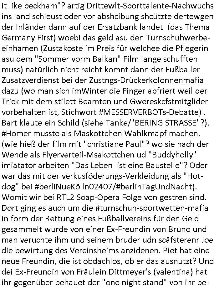 it like beckham"? artig Drittewlt-Sporttalente-Nachwuchs ins land schleust oder vor abshcibung shcützte dertewgen der Inländer dann auf der Ersatzbank landet (das Thema Germany First) woebi das geld asu den Turnschuhwerbe-einhamen (Zustakoste im Preis für welchee die Pflegerin asu dem "Sommer vorm Balkan" Film lange schufften muss) natürlich nicht reicht komnt dann der Fußballer Zusatzverdienst bei der Zustngs-Drückerkolonnenmafia dazu (wo man sich imWinter die Finger abfriert weil der Trick mit dem stilett Beamten und Gwereskcfstmitglider vorbehalten ist, Stichwort #MESSERVERBOTs-Debatte) . Bart klaute ein Schild (siehe Tanke/"BERING STRASSE"?). #Homer musste als Maskottchen Wahlkmapf machen. (wie hieß der film mit "christiane Paul"? wo sie nach der Wende als Flyerverteil-Msakottchen ud "Buddyholly" imiatator arbeiten "Das Leben ist eine Baustelle"? Oder war das mit der verkusföderungs-Verkleidung als "Hot-dog" bei #berliNueKölln02407/#berlinTagUndNacht). Womit wir bei RTL2 Soap-Opera Folge von gestren sind. Dort ging es auch um die #turnschuh-sportwetten-mafia in form der Rettung eines Fußballvereins für den Geld gesammelt wurde von einer Ex-Freundin von Bruno und man veruchte ihm und seinem bruder udn scäfsterenr Joe die bewirtung des Vereinsheims anzidenen. Piet hat eine neue Freundin, die ist obdachlos, ob er das ausnutzt? Und dei Ex-Freundin von Fräulein Dittmeyer's (valentina) hat ihr gegenüber behauet der "one night stand" von ihr be-
