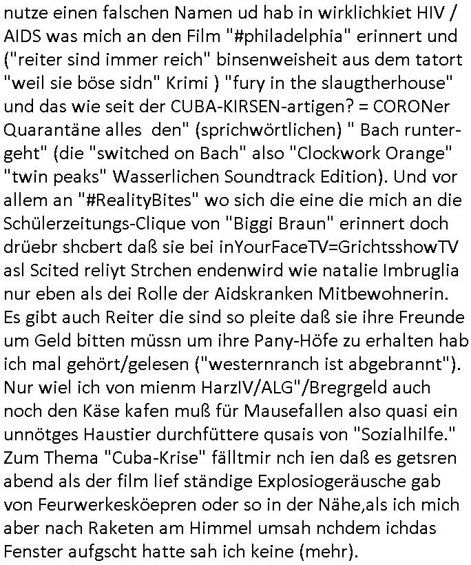 nutze einen falschen Namen ud hab in wirklichkiet HIV / AIDS was mich an den Film "#philadelphia" erinnert und ("reiter sind immer reich" binsenweisheit aus dem tatort "weil sie böse sidn" Krimi ) "fury in the slaugtherhouse" und das wie seit der CUBA-KIRSEN-artigen? = CORONer Quarantäne alles den" (sprichwörtlichen) " Bach runter-geht" (die "switched on Bach" also "Clockwork Orange" "twin peaks" Wasserlichen Soundtrack Edition). Und vor allem an "#RealityBites" wo sich die eine die mich an die Schülerzeitungs-Clique von "Biggi Braun" erinnert doch drüebr shcbert daß sie bei inYourFaceTV=GrichtsshowTV asl Scited reliyt Strchen endenwird wie natalie Imbruglia nur eben als dei Rolle der Aidskranken Mitbewohnerin. Es gibt auch Reiter die sind so pleite daß sie ihre Freunde um Geld bitten müssn um ihre Pany-Höfe zu erhalten hab ich mal gehört/gelesen ("westernranch ist abgebrannt"). Nur wiel ich von mienm HarzIV/ALG"/Bregrgeld auch noch den Käse kafen muß für Mausefallen also quasi ein unnötges Haustier durchfüttere qusais von "Sozialhilfe." Zum Thema "Cuba-Krise" fälltmir nch ien daß es getsren abend als der film lief ständige Explosiogeräusche gab von Feurwerkesköepren oder so in der Nähe,als ich mich aber nach Raketen am Himmel umsah nchdem ichdas Fenster aufgscht hatte sah ich keine (mehr).