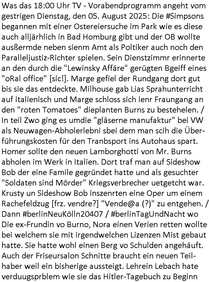Was das 18:00 Uhr TV - Vorabendprogramm angeht vom gestrigen Dienstag, den 05. August 2025: Die #Simpsons begannen mit einer Ostereiersuche im Park wie es diese auch alljärhlich in Bad Homburg gibt und der OB wollte ausßermde neben sienm Amt als Poltiker auch noch den Paralleljustiz-Richter spielen. Sein Dienstzimmr erinnerte an den durch die "Lewinsky Affäre" gerügten Bgeiff eines "oRal office" [sic!]. Marge gefiel der Rundgang dort gut bis sie das entdeckte. Milhouse gab Lias Sprahunterricht auf italienisch und Marge schloss sich ienr Fraungang an den "roten Tomatoes" dieplanten Burns zu bestehelen. / In teil Zwo ging es umdie "gläserne manufaktur" bei VW als Neuwagen-Abholerlebni sbei dem man scih die Über-führungskosten für den Tranbsport ins Autohaus spart. Homer sollte den neuen Lamborghotti von Mr. Burns abholen im Werk in Italien. Dort traf man auf Sideshow Bob der eine Famile gegründet hatte und als gesuchter "Soldaten sind Mörder" Kriegsverbrecher uetgetcht war. Krusty un Sideshow Bob inszenrten eine Oper um einem Rachefeldzug [frz. vendre?] "Vende@a (?)" zu entgehen. / Dann #berlinNeuKölln20407 / #berlinTagUndNacht wo Die ex-Frundin vo Burno, Nora einen Verien retten wollte bei welchem sie mit irgendwelchen Lizenzen Mist gebaut hatte. Sie hatte wohl einen Berg vo Schulden angehäuft. Auch der Friseursalon Schnitte braucht ein neuen Teil-haber weil ein bisherige aussteigt. Lehrein Lebach hate verduugsprblem wie sie das Hitler-Tagebuch zu Beginn