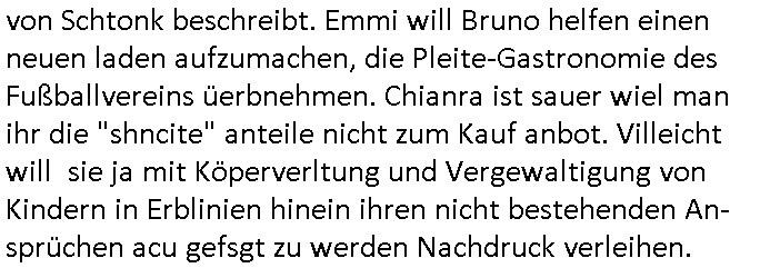 von Schtonk beschreibt. Emmi will Bruno helfen einen neuen laden aufzumachen, die Pleite-Gastronomie des Fußballvereins üerbnehmen. Chianra ist sauer wiel man ihr die "shncite" anteile nicht zum Kauf anbot. Villeicht will sie ja mit Köperverltung und Vergewaltigung von Kindern in Erblinien hinein ihren nicht bestehenden An-sprüchen acu gefsgt zu werden Nachdruck verleihen.