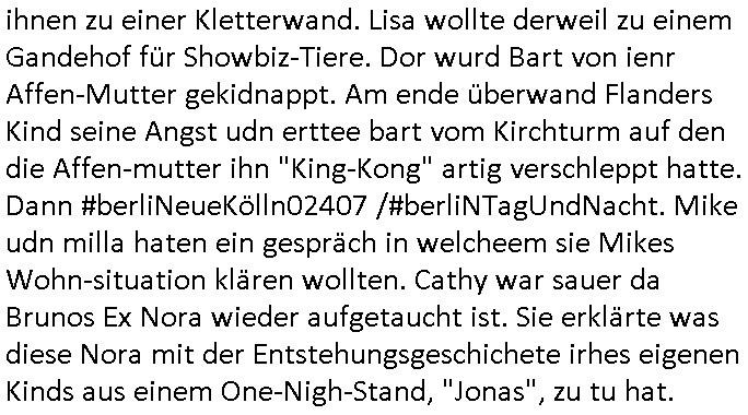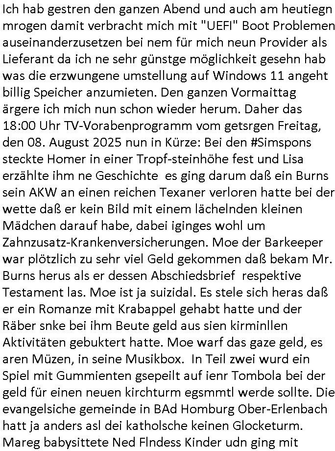 09.08.2025 14:30 Ich hab gestren den ganzen Abend und auch am heutiegn mrogen damit verbracht mich mit "UEFI" Boot Problemen auseinanderzusetzen bei nem für mich neun Provider als Lieferant da ich ne sehr günstge möglichkeit gesehn hab was die erzwungene umstellung auf Windows 11 angeht billig Speicher anzumieten. Den ganzen Vormaittag ärgere ich mich nun schon wieder herum. Daher das 18:00 Uhr TV-Vorabenprogramm vom getsrgen Freitag, den 08. August 2025 nun in Kürze: Bei den #Simspons steckte Homer in einer Tropf-steinhöhe fest und Lisa erzählte ihm ne Geschichte es ging darum daß ein Burns sein AKW an einen reichen Texaner verloren hatte bei der wette daß er kein Bild mit einem lächelnden kleinen Mädchen darauf habe, dabei iginges wohl um Zahnzusatz-Krankenversicherungen. Moe der Barkeeper war plötzlich zu sehr viel Geld gekommen daß bekam Mr. Burns herus als er dessen Abschiedsbrief respektive Testament las. Moe ist ja suizidal. Es stele sich heras daß er ein Romanze mit Krabappel gehabt hatte und der Räber snke bei ihm Beute geld aus sien kirminllen Aktivitäten gebuktert hatte. Moe warf das gaze geld, es aren Müzen, in seine Musikbox. In Teil zwei wurd ein Spiel mit Gummienten gsepeilt auf ienr Tombola bei der geld für einen neuen kirchturm egsmmtl werde sollte. Die evangelsiche gemeinde in BAd Homburg Ober-Erlenbach hatt ja anders asl dei katholsche keinen Glocketurm. Mareg babysittete Ned Flndess Kinder udn ging mit ihnen zu einer Kletterwand. Lisa wollte derweil zu einem Gandehof für Showbiz-Tiere. Dor wurd Bart von ienr Affen-Mutter gekidnappt. Am ende überwand Flanders Kind seine Angst udn erttee bart vom Kirchturm auf den die Affen-mutter ihn "King-Kong" artig verschleppt hatte. Dann #berliNeueKölln02407 /#berliNTagUndNacht. Mike udn milla haten ein gespräch in welcheem sie Mikes Wohn-situation klären wollten. Cathy war sauer da Brunos Ex Nora wieder aufgetaucht ist. Sie erklärte was diese Nora mit der Entstehungsgeschichete irhes eigenen Kinds aus einem One-Nigh-Stand, "Jonas", zu tu hat. https://tvinfo.de/fernsehprogramm/2183075988-die-simpsons https://tvinfo.de/fernsehprogramm/2183076006-die-simpsons [0] "202508091430-0-1.jpg" [1] "202508091430-0-2.jpg" |