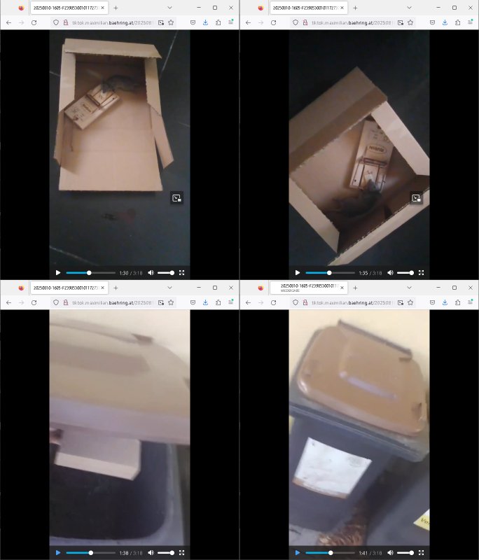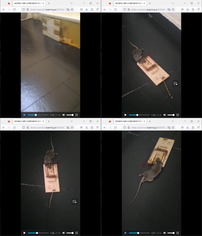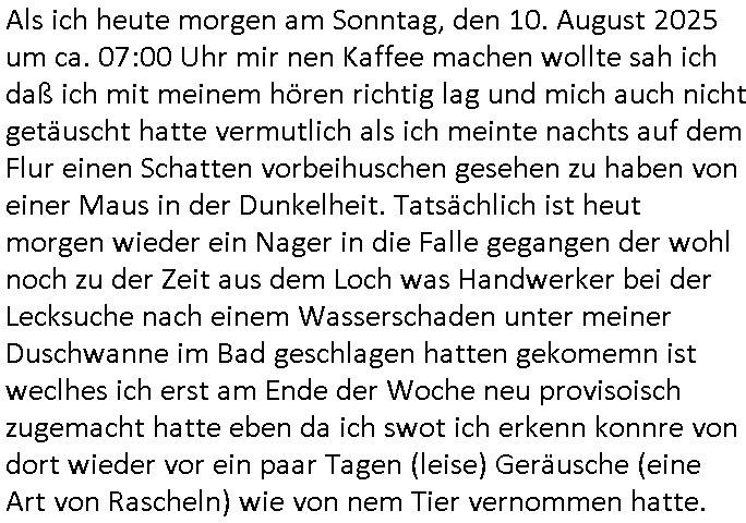Als ich heute morgen am Sonntag, den 10. August 2025 um ca. 07:00 Uhr mir nen Kaffee machen wollte sah ich daß ich mit meinem hören richtig lag und mich auch nicht getäuscht hatte vermutlich als ich meinte nachts auf dem Flur einen Schatten vorbeihuschen gesehen zu haben von einer Maus in der Dunkelheit. Tatsächlich ist heut morgen wieder ein Nager in die Falle gegangen der wohl noch zu der Zeit aus dem Loch was Handwerker bei der Lecksuche nach einem Wasserschaden unter meiner Duschwanne im Bad geschlagen hatten gekomemn ist weclhes ich erst am Ende der Woche neu provisoisch zugemacht hatte eben da ich swot ich erkenn konnre von dort wieder vor ein paar Tagen (leise) Geräusche (eine Art von Rascheln) wie von nem Tier vernommen hatte.