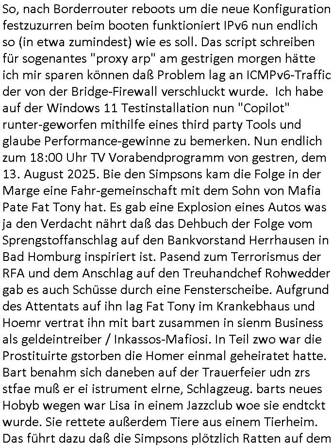 So, nach Borderrouter reboots um die neue Konfiguration festzuzurren beim booten funktioniert IPv6 nun endlich so (in etwa zumindest) wie es soll. Das script schreiben für sogenantes "proxy arp" am gestrigen morgen hätte ich mir sparen können daß Problem lag an ICMPv6-Traffic der von der Bridge-Firewall verschluckt wurde. Ich habe auf der Windows 11 Testinstallation nun "Copilot" runter-geworfen mithilfe eines third party Tools und glaube Performance-gewinne zu bemerken. Nun endlich zum 18:00 Uhr TV Vorabendprogramm von gestren, dem 13. August 2025. Bie den Simpsons kam die Folge in der Marge eine Fahr-gemeinschaft mit dem Sohn von Mafia Pate Fat Tony hat. Es gab eine Explosion eines Autos was ja den Verdacht nährt daß das Dehbuch der Folge vom Sprengstoffanschlag auf den Bankvorstand Herrhausen in Bad Homburg inspiriert ist. Pasend zum Terrorismus der RFA und dem Anschlag auf den Treuhandchef Rohwedder gab es auch Schüsse durch eine Fensterscheibe. Aufgrund des Attentats auf ihn lag Fat Tony im Krankebhaus und Hoemr vertrat ihn mit bart zusammen in sienm Business als geldeintreiber / Inkassos-Mafiosi. In Teil zwo war die Prostituirte gstorben die Homer einmal geheiratet hatte. Bart benahm sich daneben auf der Trauerfeier udn zrs stfae muß er ei istrument elrne, Schlagzeug. barts neues Hobyb wegen war Lisa in einem Jazzclub woe sie endtckt wurde. Sie rettete außerdem Tiere aus einem Tierheim. Das führt dazu daß die Simpsons plötzlich Ratten auf dem