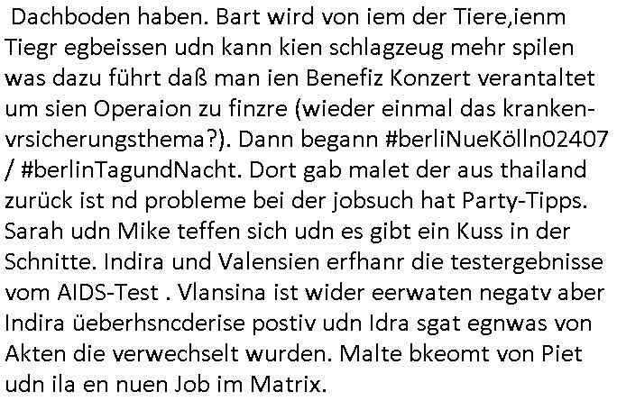 Dachboden haben. Bart wird von iem der Tiere,ienm Tiegr egbeissen udn kann kien schlagzeug mehr spilen was dazu führt daß man ien Benefiz Konzert verantaltet um sien Operaion zu finzre (wieder einmal das kranken-vrsicherungsthema?). Dann begann #berliNueKölln02407 / #berlinTagundNacht. Dort gab malet der aus thailand zurück ist nd probleme bei der jobsuch hat Party-Tipps. Sarah udn Mike teffen sich udn es gibt ein Kuss in der Schnitte. Indira und Valensien erfhanr die testergebnisse vom AIDS-Test . Vlansina ist wider eerwaten negatv aber Indira üeberhsncderise postiv udn Idra sgat egnwas von Akten die verwechselt wurden. Malte bkeomt von Piet udn ila en nuen Job im Matrix.