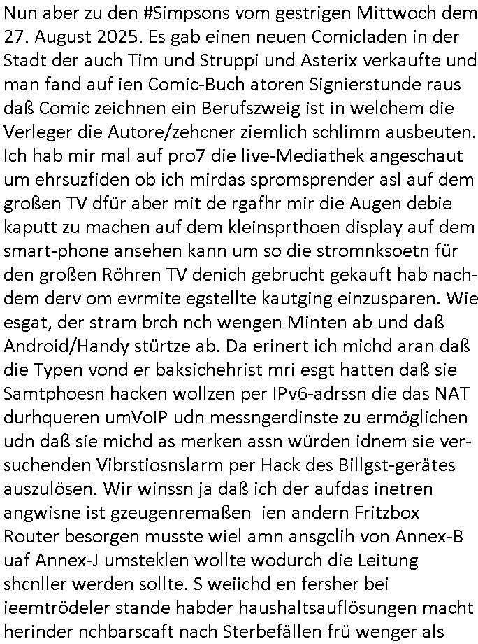 Nun aber zu den #Simpsons vom gestrigen Mittwoch dem 27. August 2025. Es gab einen neuen Comicladen in der Stadt der auch Tim und Struppi und Asterix verkaufte und man fand auf ien Comic-Buch atoren Signierstunde raus daß Comic zeichnen ein Berufszweig ist in welchem die Verleger die Autore/zehcner ziemlich schlimm ausbeuten. Ich hab mir mal auf pro7 die live-Mediathek angeschaut um ehrsuzfiden ob ich mirdas spromsprender asl auf dem großen TV dfür aber mit de rgafhr mir die Augen debie kaputt zu machen auf dem kleinsprthoen display auf dem smart-phone ansehen kann um so die stromnksoetn für den großen Röhren TV denich gebrucht gekauft hab nach-dem derv om evrmite egstellte kautging einzusparen. Wie esgat, der stram brch nch wengen Minten ab und daß Android/Handy stürtze ab. Da erinert ich michd aran daß die Typen vond er baksichehrist mri esgt hatten daß sie Samtphoesn hacken wollzen per IPv6-adrssn die das NAT durhqueren umVoIP udn messngerdinste zu ermöglichen udn daß sie michd as merken assn würden idnem sie ver-suchenden Vibrstiosnslarm per Hack des Billgst-gerätes auszulösen. Wir winssn ja daß ich der aufdas inetren angwisne ist gzeugenremaßen ien andern Fritzbox Router besorgen musste wiel amn ansgclih von Annex-B uaf Annex-J umsteklen wollte wodurch die Leitung shcnller werden sollte. S weiichd en fersher bei ieemtrödeler stande habder haushaltsauflösungen macht herinder nchbarscaft nach Sterbefällen frü wenger als