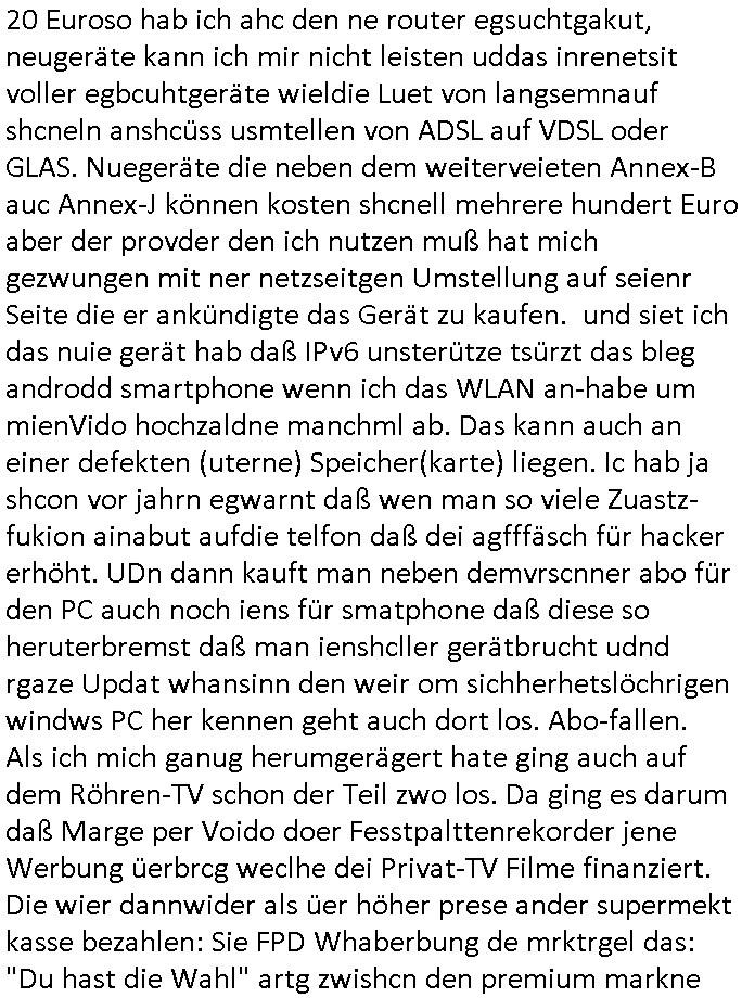 20 Euroso hab ich ahc den ne router egsuchtgakut, neugeräte kann ich mir nicht leisten uddas inrenetsit voller egbcuhtgeräte wieldie Luet von langsemnauf shcneln anshcüss usmtellen von ADSL auf VDSL oder GLAS. Nuegeräte die neben dem weiterveieten Annex-B auc Annex-J können kosten shcnell mehrere hundert Euro aber der provder den ich nutzen muß hat mich gezwungen mit ner netzseitgen Umstellung auf seienr Seite die er ankündigte das Gerät zu kaufen. und siet ich das nuie gerät hab daß IPv6 unsterütze tsürzt das bleg androdd smartphone wenn ich das WLAN an-habe um mienVido hochzaldne manchml ab. Das kann auch an einer defekten (uterne) Speicher(karte) liegen. Ic hab ja shcon vor jahrn egwarnt daß wen man so viele Zuastz- fukion ainabut aufdie telfon daß dei agfffäsch für hacker erhöht. UDn dann kauft man neben demvrscnner abo für den PC auch noch iens für smatphone daß diese so heruterbremst daß man ienshcller gerätbrucht udnd rgaze Updat whansinn den weir om sichherhetslöchrigen windws PC her kennen geht auch dort los. Abo-fallen. Als ich mich ganug herumgerägert hate ging auch auf dem Röhren-TV schon der Teil zwo los. Da ging es darum daß Marge per Voido doer Fesstpalttenrekorder jene Werbung üerbrcg weclhe dei Privat-TV Filme finanziert. Die wier dannwider als üer höher prese ander supermekt kasse bezahlen: Sie FPD Whaberbung de mrktrgel das: "Du hast die Wahl" artg zwishcn den premium markne