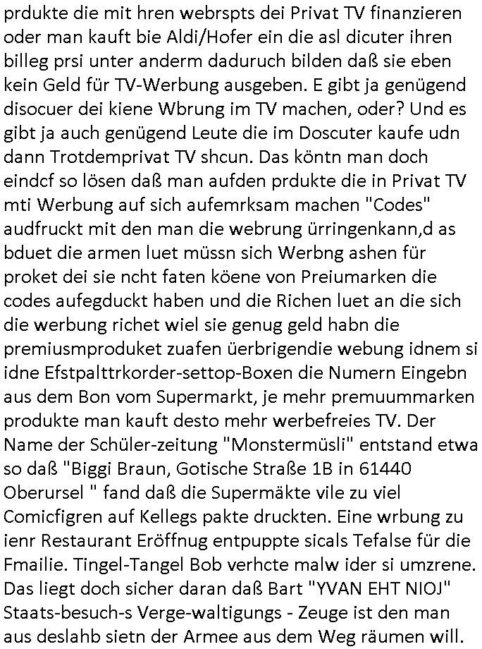 prdukte die mit hren webrspts dei Privat TV finanzieren oder man kauft bie Aldi/Hofer ein die asl dicuter ihren billeg prsi unter anderm daduruch bilden daß sie eben kein Geld für TV-Werbung ausgeben. E gibt ja genügend disocuer dei kiene Wbrung im TV machen, oder? Und es gibt ja auch genügend Leute die im Doscuter kaufe udn dann Trotdemprivat TV shcun. Das köntn man doch eindcf so lösen daß man aufden prdukte die in Privat TV mti Werbung auf sich aufemrksam machen "Codes" audfruckt mit den man die webrung ürringenkann,d as bduet die armen luet müssn sich Werbng ashen für proket dei sie ncht faten köene von Preiumarken die codes aufegduckt haben und die Richen luet an die sich die werbung richet wiel sie genug geld habn die premiusmproduket zuafen üerbrigendie webung idnem si idne Efstpalttrkorder-settop-Boxen die Numern Eingebn aus dem Bon vom Supermarkt, je mehr premuummarken produkte man kauft desto mehr werbefreies TV. Der Name der Schüler-zeitung "Monstermüsli" entstand etwa so daß "Biggi Braun, Gotische Straße 1B in 61440 Oberursel " fand daß die Supermäkte vile zu viel Comicfigren auf Kellegs pakte druckten. Eine wrbung zu ienr Restaurant Eröffnug entpuppte sicals Tefalse für die Fmailie. Tingel-Tangel Bob verhcte malw ider si umzrene. Das liegt doch sicher daran daß Bart "YVAN EHT NIOJ" Staats-besuch-s Verge-waltigungs - Zeuge ist den man aus deslahb sietn der Armee aus dem Weg räumen will.