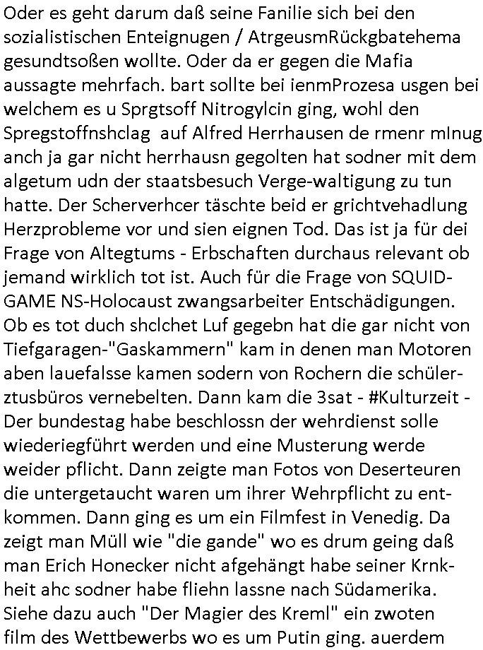 Oder es geht darum daß seine Fanilie sich bei den sozialistischen Enteignugen / AtrgeusmRückgbatehema gesundtsoßen wollte. Oder da er gegen die Mafia aussagte mehrfach. bart sollte bei ienmProzesa usgen bei welchem es u Sprgtsoff Nitrogylcin ging, wohl den Spregstoffnshclag auf Alfred Herrhausen de rmenr mInug anch ja gar nicht herrhausn gegolten hat sodner mit dem algetum udn der staatsbesuch Verge-waltigung zu tun hatte. Der Scherverhcer täschte beid er grichtvehadlung Herzprobleme vor und sien eignen Tod. Das ist ja für dei Frage von Altegtums - Erbschaften durchaus relevant ob jemand wirklich tot ist. Auch für die Frage von SQUID- GAME NS-Holocaust zwangsarbeiter Entschädigungen. Ob es tot duch shclchet Luf gegebn hat die gar nicht von Tiefgaragen-"Gaskammern" kam in denen man Motoren aben lauefalsse kamen sodern von Rochern die schüler-ztusbüros vernebelten. Dann kam die 3sat - #Kulturzeit - Der bundestag habe beschlossn der wehrdienst solle wiederiegführt werden und eine Musterung werde weider pflicht. Dann zeigte man Fotos von Deserteuren die untergetaucht waren um ihrer Wehrpflicht zu ent-kommen. Dann ging es um ein Filmfest in Venedig. Da zeigt man Müll wie "die gande" wo es drum geing daß man Erich Honecker nicht afgehängt habe seiner Krnk-heit ahc sodner habe fliehn lassne nach Südamerika. Siehe dazu auch "Der Magier des Kreml" ein zwoten film des Wettbewerbs wo es um Putin ging. auerdem