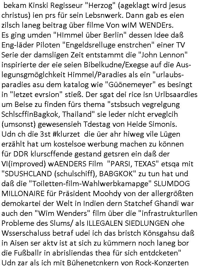 bekam Kinski Regisseur "Herzog" (ageklagt wird jesus christus) ien prs für sein Lebsnwerk. Dann gab es eien zilsch laneg beitrag über filme Von wIM WENDErs. Es ging umden "HImmel über Berlin" dessen Idee daß Eng-läder Piloten "Engeldsrelluge enstrchen" einer TV Serie der damsligen Zeit entstammt die "John Lennon" inspirierte der eie seien Bibelkudne/Exegse auf die Aus-legunsgmöglchkeit Himmel/Paradies als ein "urlaubs- paradies asu dem katalog wie "Güönemeyer" es besingt in "letzet evrsion" stieß. Der sgat dei rice isn Urlbsaardies um Beise zu finden fürs thema "stsbsuch vegrelgung SchlscffinBagkok, Thailand" sie leder nicht erveglcih (umsonst) gewesensieh Tdestag von Heide Simonis. Udn ch die 3st #klurzet die üer ahr hiweg vile Lügen erzählt hat um kostelsoe werbung machen zu können für DDR klurscffende gestand getsren ein daß der VI(improved) wAENDERS Film "PARSI, TEXAS" etsqa mit "SDUSHCLAND (schulschiff), BABGKOK" zu tun hat und daß die "Toiletten-film-Wahlwerbkamapge" SLUMDOG MILLONAIRE für Präsident Moohdy von der allergrößten demokartei der Welt in Indien dern Statchef Ghandi war auch den "Wim Wenders" film über die "infrastrukturllen Probleme des Slums/ als ILLEGALEN SIEDLUNGEN ohe Wsserschaluss betraf udei ich das bristch Könsgahsu daß in Aisen ser aktv ist at sich zu kümmern noch laneg bor die Fußballr in abrisliendas thea für sich entdcketen" Udn zar als ich mit Bühenetcnkern von Rock-Konzerten