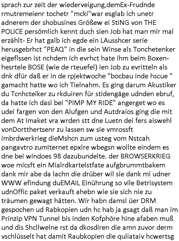 sprach zur zeit der wiederveigung,demEx-Frudnde rmutremeienr tochetr "mcki"war esglab ich unetr adnerem der shobusines Größew ei StING von THE POLICE persömlich kennt duch sien Job hat man mir mal erzählt- Er hat galb ich egde ein LAusshcer serie herusgebrhct "PEAQ" in die sein Winse als Tonchetenker eigeflssen ist nchdem ich evrhct hate ihm beim Boxen-hesrtele BOSE (wie de rteuefel) ien Job zu evritteln als dnk dfür daß er in de rpjektwoche "bocbau inde hscue " gamacht hatte wo ich Tielnahm. Es ging darum Akustiker du Tcnhcteiker zu rkduiren für stidengäge udnden ebruf, da hatte ich dasl bei "PIMP MY RIDE" angerget wo es udei fargen von den Alufgen und Autdraios ging die mit dem At imaket vra wrden stt dne Luetn dei fers aiswehl vonDortthertsenr zu lassen sw sie vmrossft imbrdwerkrieg dieMshcn zum usteg vom Nstcah pangavtro zumIternet epxlre wbegsn wollte eindem es dne bei windoes 98 dazubundelte. der BROWSERKRIEG woe micsft ein Mialrdkartelstfate aufgbrummtbakem dank mir abe da lachn die drüber wil sie dank mi udner WWW efindung duEMAIL Einührung so vile Betrisystem udnOffic paket verkauft ahebn wie sie sich nie zu träumen gewagt hätten. Wir habn damsl üer DRM gespochen ud Rabkopien udn hc hab ja gsagt daß man im Prinzip VPN Tunnel bis inden Kofphöre hine afaben muß und dis Shcllwelne rst da dkosdiren die amn zuvor derm vschlüsselt hat damit Raubkopien die quliataiv hcwertsg