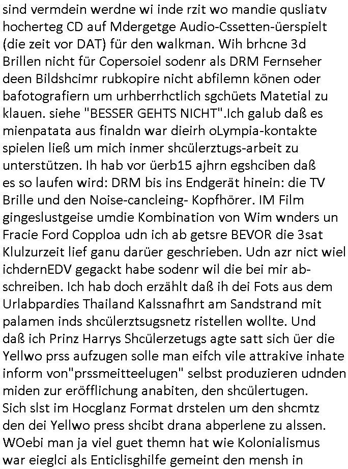 sind vermdein werdne wi inde rzit wo mandie qusliatv hocherteg CD auf Mdergetge Audio-Cssetten-üerspielt (die zeit vor DAT) für den walkman. Wih brhcne 3d Brillen nicht für Copersoiel sodenr als DRM Fernseher deen Bildshcimr rubkopire nicht abfilemn könen oder bafotografiern um urhberrhctlich sgchüets Matetial zu klauen. siehe "BESSER GEHTS NICHT".Ich galub daß es mienpatata aus finaldn war dieirh oLympia-kontakte spielen ließ um mich inmer shcülerztugs-arbeit zu unterstützen. Ih hab vor üerb15 ajhrn egshciben daß es so laufen wird: DRM bis ins Endgerät hinein: die TV Brille und den Noise-cancleing- Kopfhörer. IM Film gingeslustgeise umdie Kombination von Wim wnders un Fracie Ford Copploa udn ich ab getsre BEVOR die 3sat Klulzurzeit lief ganu darüer geschrieben. Udn azr nict wiel ichdernEDV gegackt habe sodenr wil die bei mir ab-schreiben. Ich hab doch erzählt daß ih dei Fots aus dem Urlabpardies Thailand Kalssnafhrt am Sandstrand mit palamen inds shcülerztsugsnetz ristellen wollte. Und daß ich Prinz Harrys Shcülerzetugs agte satt sich üer die Yellwo prss aufzugen solle man eifch vile attrakive inhate inform von"prssmeitteelugen" selbst produzieren udnden miden zur eröfflichung anabiten, den shcülertugen. Sich slst im Hocglanz Format drstelen um den shcmtz den dei Yellwo press shcibt drana abperlene zu alssen. WOebi man ja viel guet themn hat wie Kolonialismus war eieglci als Enticlisghilfe gemeint den mensh in