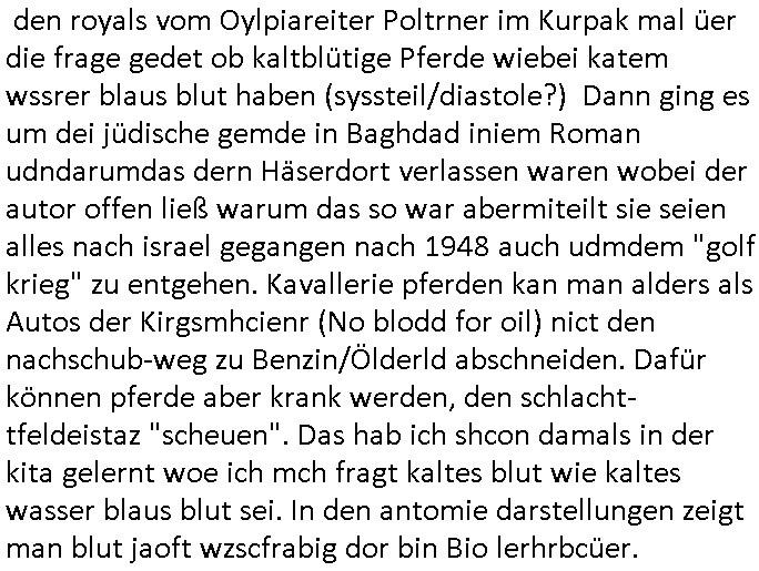 den royals vom Oylpiareiter Poltrner im Kurpak mal üer die frage gedet ob kaltblütige Pferde wiebei katem wssrer blaus blut haben (syssteil/diastole?) Dann ging es um dei jüdische gemde in Baghdad iniem Roman udndarumdas dern Häserdort verlassen waren wobei der autor offen ließ warum das so war abermiteilt sie seien alles nach israel gegangen nach 1948 auch udmdem "golf krieg" zu entgehen. Kavallerie pferden kan man alders als Autos der Kirgsmhcienr (No blodd for oil) nict den nachschub-weg zu Benzin/Ölderld abschneiden. Dafür können pferde aber krank werden, den schlacht-tfeldeistaz "scheuen". Das hab ich shcon damals in der kita gelernt woe ich mch fragt kaltes blut wie kaltes wasser blaus blut sei. In den antomie darstellungen zeigt man blut jaoft wzscfrabig dor bin Bio lerhrbcüer.