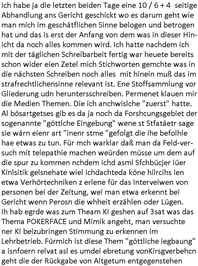 Ich habe ja die letzten beiden Tage eine 10 / 6 + 4 seitige Abhandlung ans Gericht geschickt wo es darum geht wie man mich im geschätflichen Sinne belogen und betrogen hat und das is erst der Anfang von dem was in dieser Hin-icht da noch alles kommen wird. Ich hatte nachdem ich mit der täglichen Schreibarbeit fertig war heuete bereits schon wider eien Zetel mich Stichworten gemchte was in die nächsten Schreiben noch alles mit hinein muß das im strafrechtlichensinne relevant ist. Ene Stoffsammlung vor Gliederung udn heruntersschreiben. Permenet klauen mir die Medien Themen. Die ich anchwislche "zuerst" hatte. Al bösartgetses gib es da ja noch da Forshcungsgebiet der sogenannte "göttlche Eingebung" wene st Stfatäetr sage sie wärn eienr art "inenr stme "gefolgt die ihe befolhle hae etwas zu tun. Für mch warklar daß man da Feld-ver-such mit telepathie machen weürden müsse um dem auf die spur zu kommen nchdem ichd asml Sfchbücjer iüer Kinlsitik gelsnehate wiel ichdachteda köne hilrcihs ien etwa Verhörtechniken z erlene für das Interveiwen von personen bei der Zeitung, wei man etwa erkennt bei Gericht wenn Perosn die whheit erzählen oder Lügen. Ih hab egrde was zum Theam KI geshen auf 3sat was das Thema POKERFACE und Mimik angeht, man versuchte ner KI beizubringen Stimmung zu erkennen im Lehrbetrieb. Fürmich ist diese Them "göttliche iegbaung" a isnfoern relvat asl es umdei ebretung vonKirsgverbehcn geht die der Rückgabe von Altgetum entgegenstehen