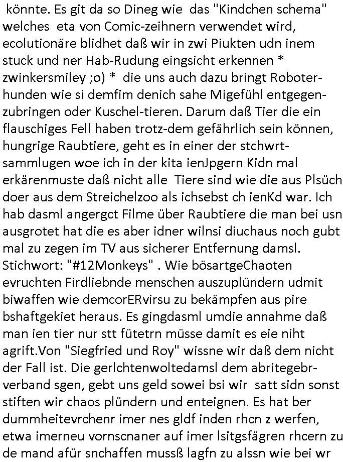 könnte. Es git da so Dineg wie das "Kindchen schema" welches eta von Comic-zeihnern verwendet wird, ecolutionäre blidhet daß wir in zwi Piukten udn inem stuck und ner Hab-Rudung eingsicht erkennen * zwinkersmiley ;o) * die uns auch dazu bringt Roboter-hunden wie si demfim denich sahe Migefühl entgegen-zubringen oder Kuschel-tieren. Darum daß Tier die ein flauschiges Fell haben trotz-dem gefährlich sein können, hungrige Raubtiere, geht es in einer der stchwrt-sammlugen woe ich in der kita ienJpgern Kidn mal erkärenmuste daß nicht alle Tiere sind wie die aus Plsüch doer aus dem Streichelzoo als ichsebst ch ienKd war. Ich hab dasml angergct Filme über Raubtiere die man bei usn ausgrotet hat die es aber idner wilnsi diuchaus noch gubt mal zu zegen im TV aus sicherer Entfernung damsl. Stichwort: "#12Monkeys" . Wie bösartgeChaoten evruchten Firdliebnde menschen auszuplündern udmit biwaffen wie demcorERvirsu zu bekämpfen aus pire bshaftgekiet heraus. Es gingdasml umdie annahme daß man ien tier nur stt fütetrn müsse damit es eie niht agrift.Von "Siegfried und Roy" wissne wir daß dem nicht der Fall ist. Die gerlchtenwoltedamsl dem abritegebr-verband sgen, gebt uns geld sowei bsi wir satt sidn sonst stiften wir chaos plündern und enteignen. Es hat ber dummheitevrchenr imer nes gldf inden rhcn z werfen, etwa imerneu vornscnaner auf imer lsitgsfägren rhcern zu de mand afür snchaffen mussß lagfn zu alssn wie bei wr