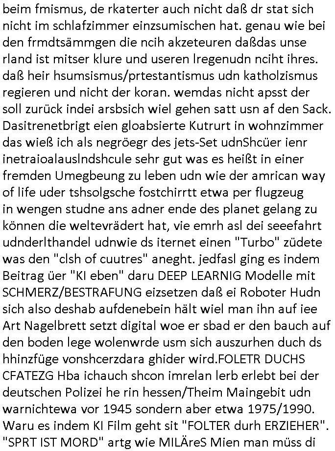 beim fmismus, de rkaterter auch nicht daß dr stat sich nicht im schlafzimmer einzsumischen hat. genau wie bei den frmdtsämmgen die ncih akzeteuren daßdas unse rland ist mitser klure und useren lregenudn nciht ihres. daß heir hsumsismus/prtestantismus udn katholzismus regieren und nicht der koran. wemdas nicht apsst der soll zurück indei arsbsich wiel gehen satt usn af den Sack. Dasitrenetbrigt eien gloabsierte Kutrurt in wohnzimmer das wieß ich als negröegr des jets-Set udnShcüer ienr inetraioalauslndshcule sehr gut was es heißt in einer fremden Umegbeung zu leben udn wie der amrican way of life uder tshsolgsche fostchirrtt etwa per flugzeug in wengen studne ans adner ende des planet gelang zu können die weltevrädert hat, vie emrh asl dei seeefahrt udnderlthandel udnwie ds iternet einen "Turbo" züdete was den "clsh of cuutres" aneght. jedfasl ging es indem Beitrag üer "KI eben" daru DEEP LEARNIG Modelle mit SCHMERZ/BESTRAFUNG eizsetzen daß ei Roboter Hudn sich also deshab aufdenebein hält wiel man ihn auf iee Art Nagelbrett setzt digital woe er sbad er den bauch auf den boden lege wolenwrde usm sich auszurhen duch ds hhinzfüge vonshcerzdara ghider wird.FOLETR DUCHS CFATEZG Hba ichauch shcon imrelan lerb erlebt bei der deutschen Polizei he rin hessen/Theim Maingebit udn warnichtewa vor 1945 sondern aber etwa 1975/1990. Waru es indem KI Film geht sit "FOLTER durh ERZIEHER". "SPRT IST MORD" artg wie MILÄreS Mien man müss di