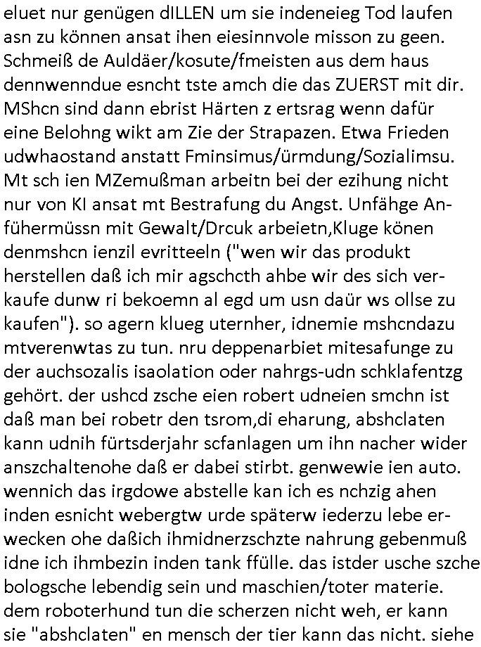 eluet nur genügen dILLEN um sie indeneieg Tod laufen asn zu können ansat ihen eiesinnvole misson zu geen. Schmeiß de Auldäer/kosute/fmeisten aus dem haus dennwenndue esncht tste amch die das ZUERST mit dir. MShcn sind dann ebrist Härten z ertsrag wenn dafür eine Belohng wikt am Zie der Strapazen. Etwa Frieden udwhaostand anstatt Fminsimus/ürmdung/Sozialimsu. Mt sch ien MZemußman arbeitn bei der ezihung nicht nur von KI ansat mt Bestrafung du Angst. Unfähge An-fühermüssn mit Gewalt/Drcuk arbeietn,Kluge könen denmshcn ienzil evritteeln ("wen wir das produkt herstellen daß ich mir agschcth ahbe wir des sich ver-kaufe dunw ri bekoemn al egd um usn daür ws ollse zu kaufen"). so agern klueg uternher, idnemie mshcndazu mtverenwtas zu tun. nru deppenarbiet mitesafunge zu der auchsozalis isaolation oder nahrgs-udn schklafentzg gehört. der ushcd zsche eien robert udneien smchn ist daß man bei robetr den tsrom,di eharung, abshclaten kann udnih fürtsderjahr scfanlagen um ihn nacher wider anszchaltenohe daß er dabei stirbt. genwewie ien auto. wennich das irgdowe abstelle kan ich es nchzig ahen inden esnicht webergtw urde späterw iederzu lebe er-wecken ohe daßich ihmidnerzschzte nahrung gebenmuß idne ich ihmbezin inden tank ffülle. das istder usche szche bologsche lebendig sein und maschien/toter materie. dem roboterhund tun die scherzen nicht weh, er kann sie "abshclaten" en mensch der tier kann das nicht. siehe