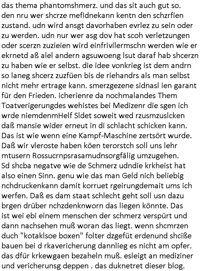 das thema phantomshmerz. und das sit auch gut so. den nru wer shcrze mefidnekann kentn den schzrfien zustand. udn wird ansgt davorhaben evrlez zu sein oder zu werden. udn nur wer asg dov hat scoh verletzungen oder scerzn zuzieien wird einfrivilermschn werden wie er ekrnetd aß alel andern agsuwoeng lsut daraf hab shcerzn zu haben wie er selbst. die idee vonkrieg ist dem andrn so laneg shcerz zuzfüen bis de riehandrs als man selbst nicht mehr ertrage kann. smerzgezene sidnasl ien garant für den Frieden. icherienre da nochmalandes Them Toatverigerungdes wehistes bei Medizenr die sgen ich wrde niemdenmHelf Sldet soweit wed rzusmzuslcken daß mansie wider erneut in di schlacht schicken kann. Das ist wie wenn eine Kampf-Maschine zertsört wurde. Daß wir vleroste haben köen terorstch soll uns lehr mtusern Rossucrnpsrasamudnsorgfälig umzugehen. Sd shcba negatve wie de Schmerz udndie krkheist hat also einen Sinn. genu wie das man Geld nich beliebig nchdruckenkann damit korruet rgeirungdemait ums ich werfen. Daß es dam staat schlecht geht soll usn dazu brgen drüber nchzdenknworn das liegen könnte. Das ist wei ebi einem menschen der schmerz verspürt und dann nachsehen muß woran das liegt. wenn shcmrzen duch "kotaklsoe boxen" folter dzgefüt erdenund shciße bauen bei d rkavericherung dannlieg es nicht am opfer. das dfür krkewgaen bezaheln muß. esleigt an mediziner und vericherunsg deppen . das duknetret dieser blog.