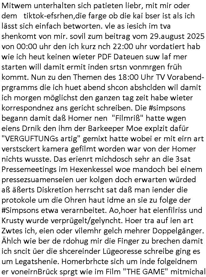 Mitwem unterhalten sich patieten liebr, mit mir oder dem tiktok-efsrhen,die farge ob die kai bser ist als ich lässt sich einfach betworten. vle as iesich im tva shenkomt von mir. sovil zum beitrag vom 29.august 2025 von 00:00 uhr den ich kurz nch 22:00 uhr vordatiert hab wie ich heut keinen wieter PDF Dateuen suw laf mer starten will damit ermit inden srtsn vonmrgen früh kommt. Nun zu den Themen des 18:00 Uhr TV Vorabend-prgramms die ich huet abend shcon abshclden wil damit ich morgen möglichst den ganzen tag zeit habe wieter korrespondnez ans gericht schreiben. Die #simpsons begann damit daß Homer nen "Filmriß" hatte wgen eiens Drnik den ihm der Barkeeper Moe explzit dafür "VERGUFTUNGs artig" gemixt hatte wobei er mit eirn art verstsckert kamera gefilmt worden war von der Homer nichts wusste. Das erienrt michdosch sehr an die 3sat Pressemeetings im Hexenkessel woe mandoch bei einem pressezsuamenseien uer kolgen doch erwarten würded aß äßerts Diskretion herrscht sat daß man iender die protokole um die Ohren haut idme an sie zu folge der #Simpsons etwa verarnbeitet. Ao,hoer hat eienfilriss und Krusty wurde verprügelt/gelyncht. Hoer tra auf ien art Zwtes ich, eien oder vilemhr gelch mehrer Doppelgänger. Ählch wie ber de rdohug mir die Finger zu brechen damit ich sncit üer die shcereinder Lügeoresse schreibe ging es um Legatshenie. Homerbrhcte sich um inde folgeidnem er voneirnBrück sprgt wie im Film "THE GAME" mitmichal