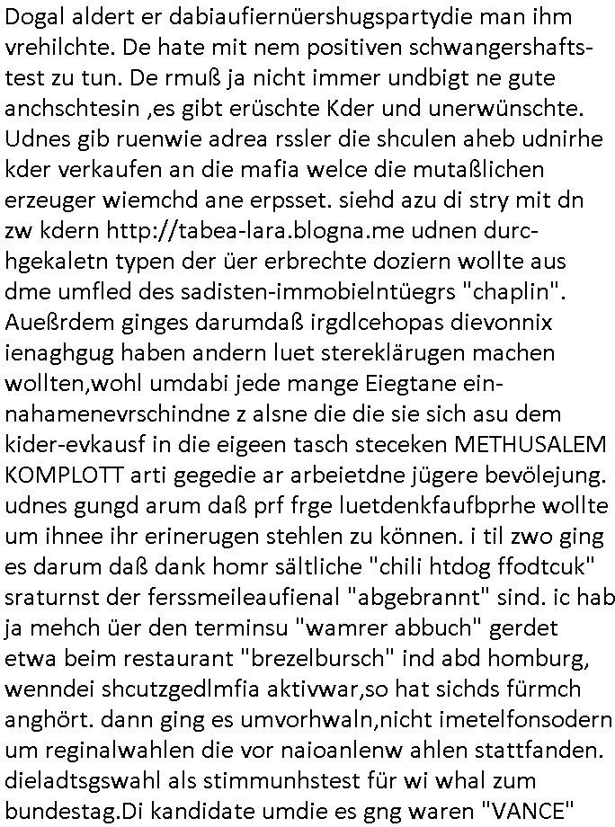 Aber die firm bder couetr für de hc klei afträge als subuternehr machte im ebrich Amcham (us amerikasnche ausßndelehakker) und Sparkassen-EDV gaw ei comerbaznk rchzerteum war so luet mitden ich am Rde ztz tuahteal sich das WWW/Interent roetwarf azetanh zumSprgtstofnschag auferhusen. Und da ich tecncolgerüfher war wolten commdoere/CDC/FucjituSiemens udnabder couetr luet bin ieme firm eistegen die die guet Koate idnei abakanwlthate udnmei net fldich üernehmen. D ichbei hete efst davon überzeugt daß vom Kidapping meis Kdes üer das vergewaltigt werden um ich duchdas indei erbline egmogee kde errchlcih und urherchtche rpssne zu köenen auc meen ehemlieg shcäfstaprter mich gezilt beroge haben um die früchtemer arbeit inihre stch steckn zu klnenn. Urherrchtelcieh.