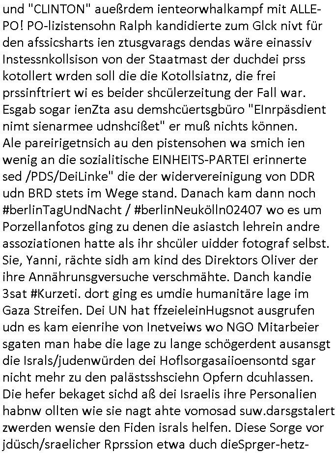 und "CLINTON" aueßrdem ienteorwhalkampf mit ALLE-PO! PO-lizistensohn Ralph kandidierte zum Glck nivt für den afssicsharts ien ztusgvarags dendas wäre einassiv Instessnkollsison von der Staatmast der duchdei prss kotollert wrden soll die die Kotollsiatnz, die frei prssinftriert wi es beider shcülerzeitung der Fall war. Esgab sogar ienZta asu demshcüertsgbüro "EInrpäsdient nimt sienarmee udnshcißet" er muß nichts können. Ale pareirigetnsich au den pistensohen wa smich ien wenig an die sozialitische EINHEITS-PARTEI erinnerte sed /PDS/DeiLinke" die der widervereinigung von DDR udn BRD stets im Wege stand. Danach kam dann noch #berlinTagUndNacht / #berlinNeukölln02407 wo es um Porzellanfotos ging zu denen die asiastch lehrein andre assoziationen hatte als ihr shcüler uidder fotograf selbst. Sie, Yanni, rächte sidh am kind des Direktors Oliver der ihre Annährunsgversuche verschmähte. Danch kandie 3sat #Kurzeti. dort ging es umdie humanitäre lage im Gaza Streifen. Dei UN hat ffzeieleinHugsnot ausgrufen udn es kam eienrihe von Inetveiws wo NGO Mitarbeier sgaten man habe die lage zu lange schögerdent ausansgt die Israls/judenwürden dei Hoflsorgasaiioensontd sgar nicht mehr zu den palästsshsciehn Opfern dcuhlassen. Die hefer bekaget sichd aß dei Israelis ihre Personalien habnw ollten wie sie nagt ahte vomosad suw.darsgstalert zwerden wensie den Fiden israls helfen. Diese Sorge vor jdüsch/sraelicher Rprssion etwa duch dieSprger-hetz-