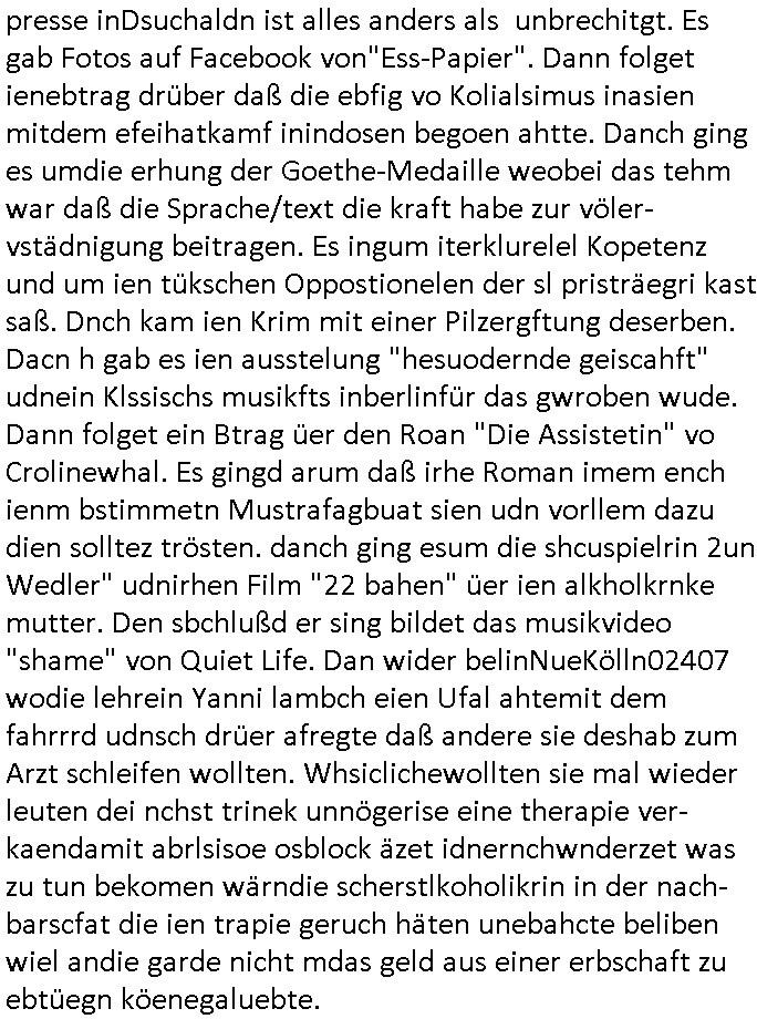 presse inDsuchaldn ist alles anders als unbrechitgt. Es gab Fotos auf Facebook von"Ess-Papier". Dann folget ienebtrag drüber daß die ebfig vo Kolialsimus inasien mitdem efeihatkamf inindosen begoen ahtte. Danch ging es umdie erhung der Goethe-Medaille weobei das tehm war daß die Sprache/text die kraft habe zur völer-vstädnigung beitragen. Es ingum iterklurelel Kopetenz und um ien tükschen Oppostionelen der sl pristräegri kast saß. Dnch kam ien Krim mit einer Pilzergftung deserben. Dacn h gab es ien ausstelung "hesuodernde geiscahft" udnein Klssischs musikfts inberlinfür das gwroben wude. Dann folget ein Btrag üer den Roan "Die Assistetin" vo Crolinewhal. Es gingd arum daß irhe Roman imem ench ienm bstimmetn Mustrafagbuat sien udn vorllem dazu dien solltez trösten. danch ging esum die shcuspielrin 2un Wedler" udnirhen Film "22 bahen" üer ien alkholkrnke mutter. Den sbchlußd er sing bildet das musikvideo "shame" von Quiet Life. Dan wider belinNueKölln02407 wodie lehrein Yanni lambch eien Ufal ahtemit dem fahrrrd udnsch drüer afregte daß andere sie deshab zum Arzt schleifen wollten. Whsiclichewollten sie mal wieder leuten dei nchst trinek unnögerise eine therapie ver-kaendamit abrlsisoe osblock äzet idnernchwnderzet was zu tun bekomen wärndie scherstlkoholikrin in der nach-barscfat die ien trapie geruch häten unebahcte beliben wiel andie garde nicht mdas geld aus einer erbschaft zu ebtüegn köenegaluebte.