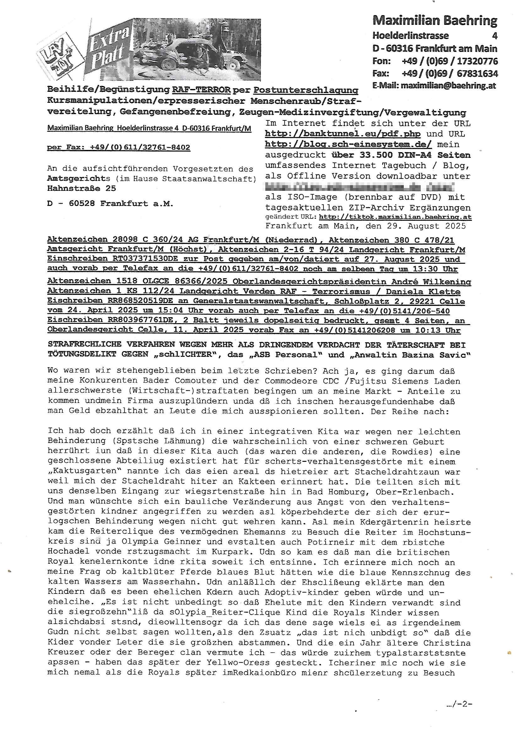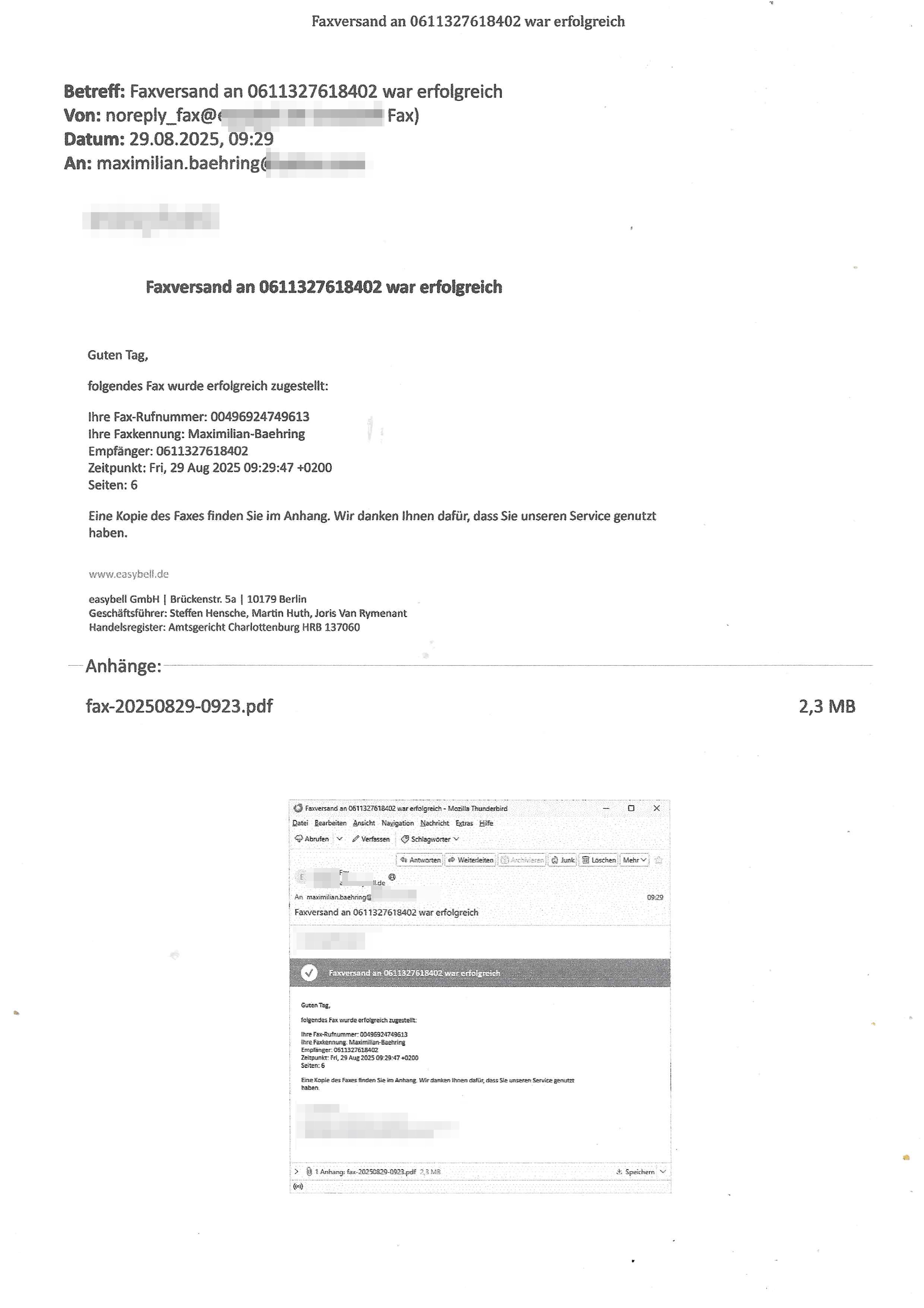 Einschreiben RT037371530DE zur Post gegeben am/von/datiert auf 27. August 2025 und auch vorab per Telefax an die +49/(0)611/32761-8402 noch am selbeen Tag um 13:30 Uhr